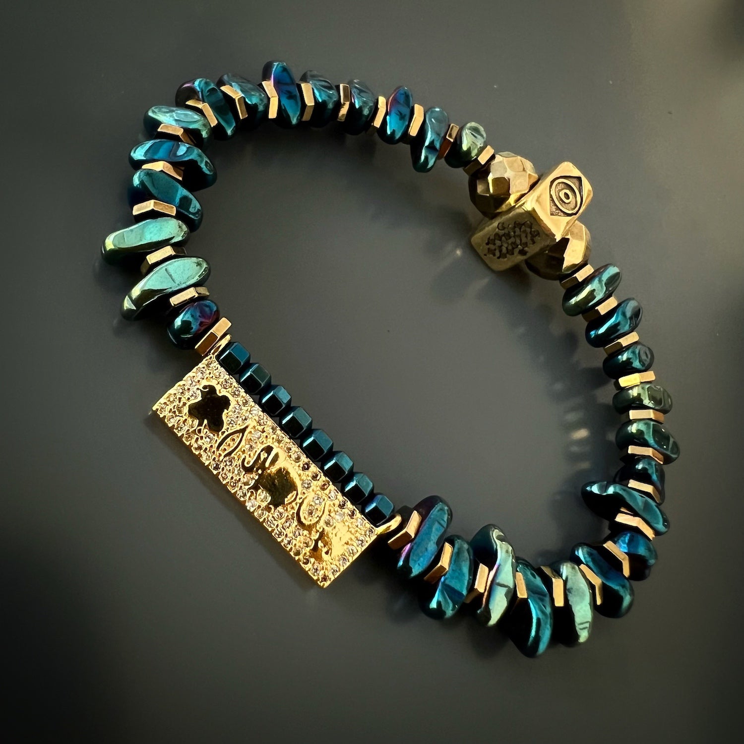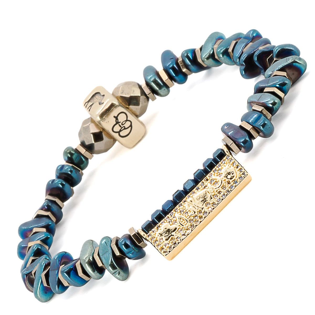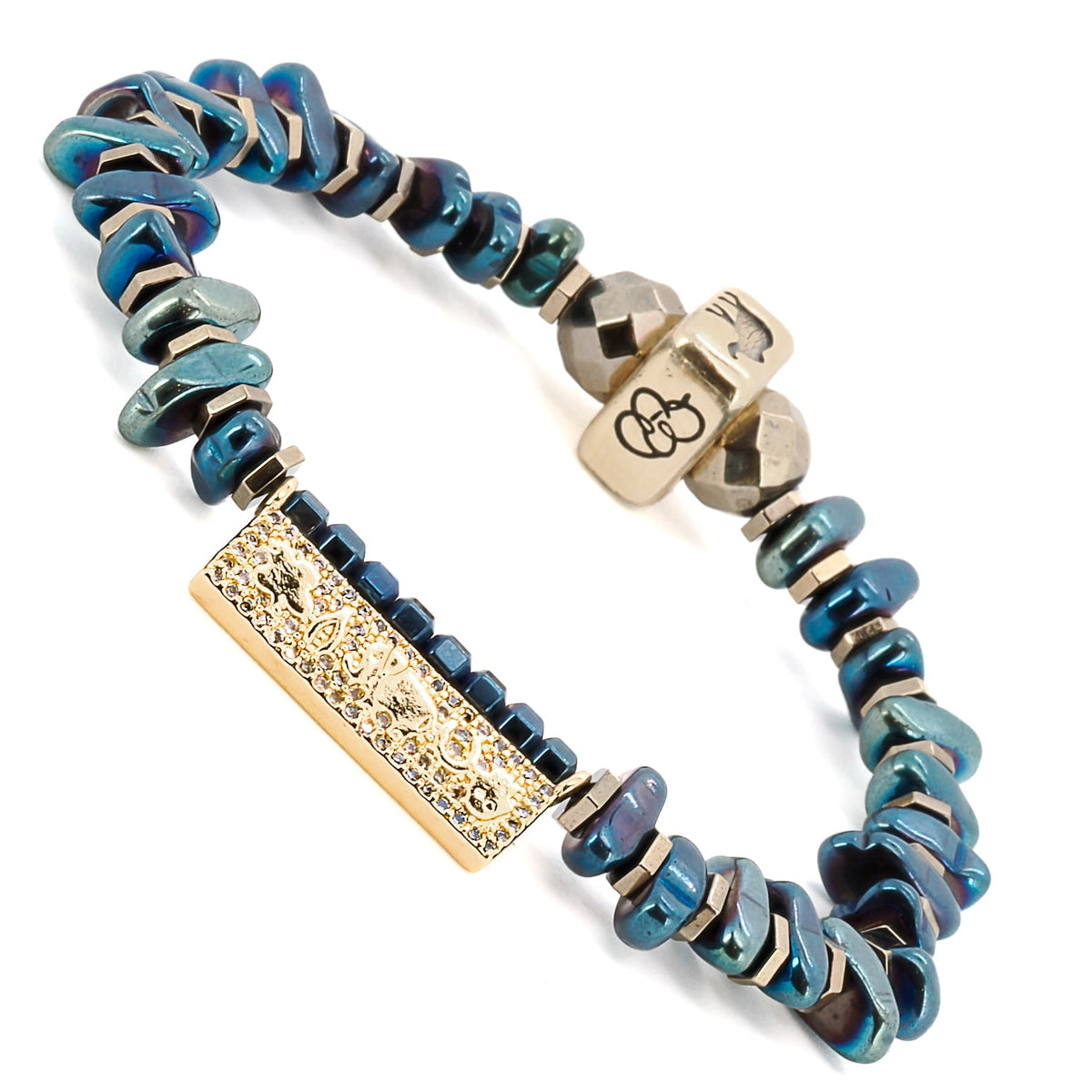 This beaded bracelet is made with nugget blue hematite stone beads, an 18-karat gold-plated symbol plate, and a bronze bead. The bracelet size is 6.5 inches.