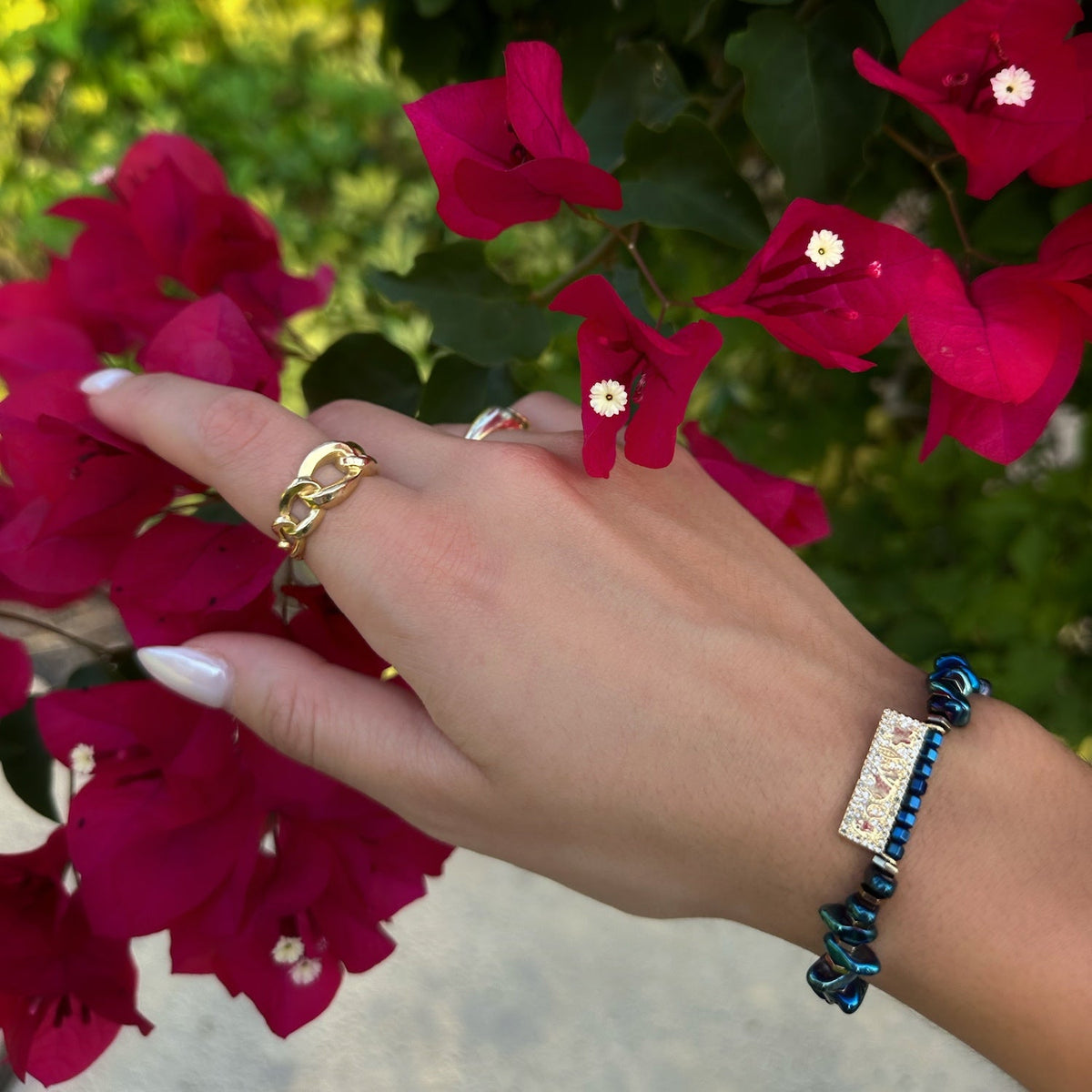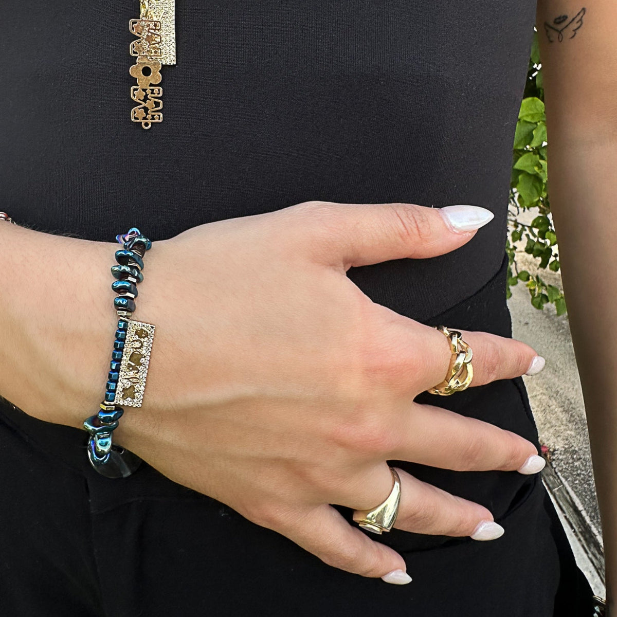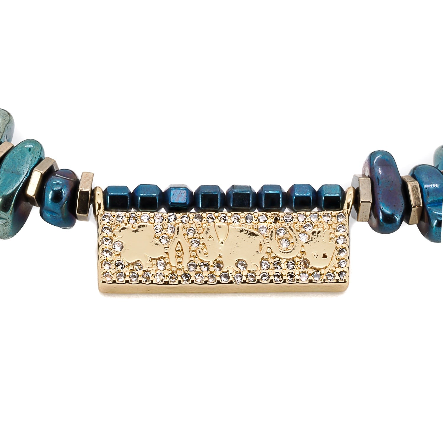 This beaded bracelet is made with nugget blue hematite stone beads, an 18-karat gold-plated symbol plate, and a bronze bead. The bracelet size is 6.5 inches.