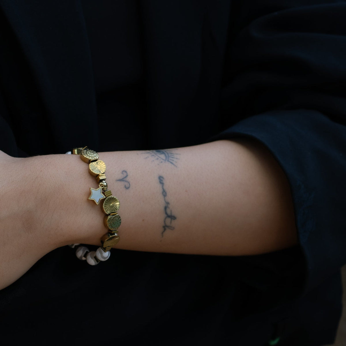The Spiritual Star Tibetan Agate & Jade Bracelet by Ebru Jewelry is a unique, handmade beaded bracelet. It features Tibetan agate stones, known for their protective properties, and a large jade stone, which adds serenity. The bracelet is centered with a spiral shell-shaped gold hematite bead and an 18-karat gold-plated white enamel star charm symbolizing guidance.