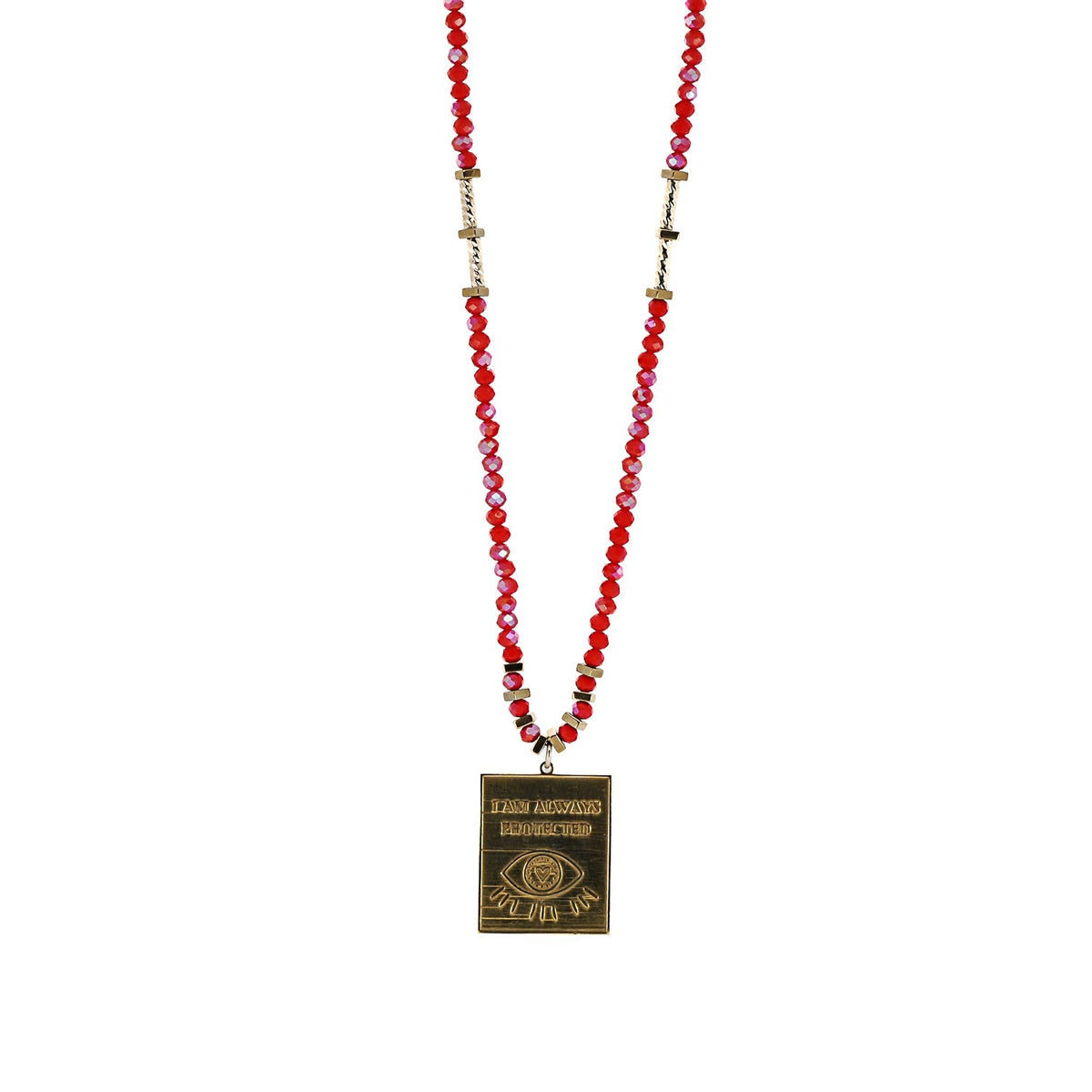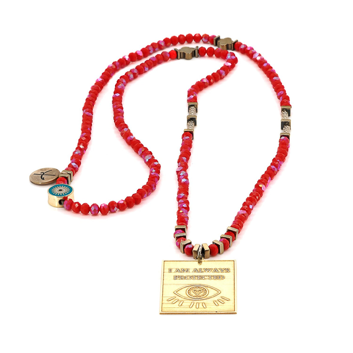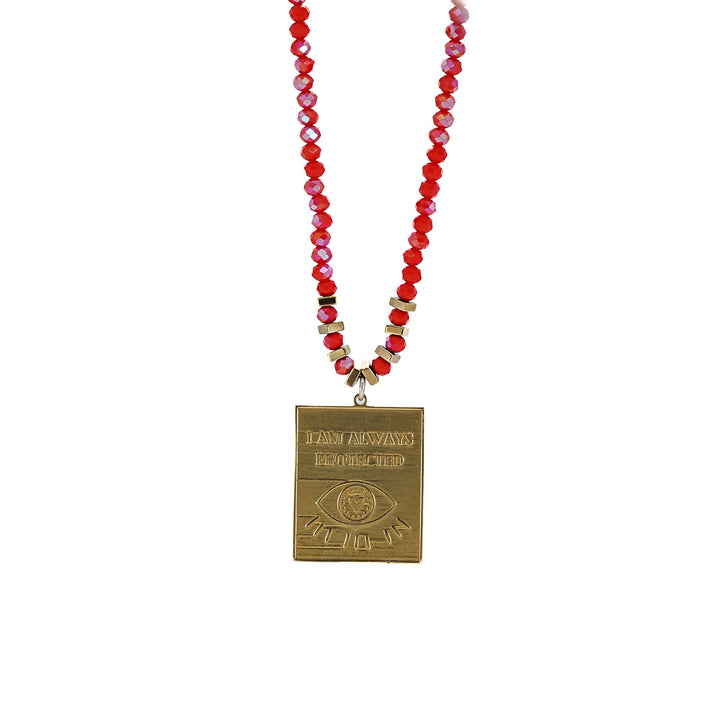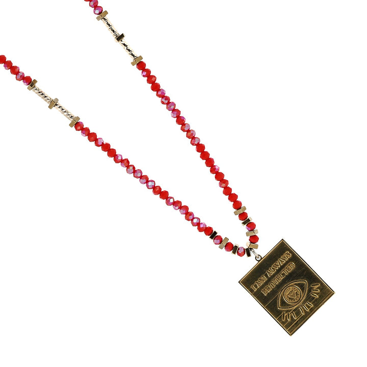 The I Am Always Protected Gold Pendant Red Beaded Necklace - Red by Ebru Jewelry is a spiritual and elegant handmade necklace. It features red faceted crystal beads and gold hematite spacers. The focal point is a sterling silver pendant plated with 18-karat gold, which has the message "I am always protected" and an evil eye symbol.