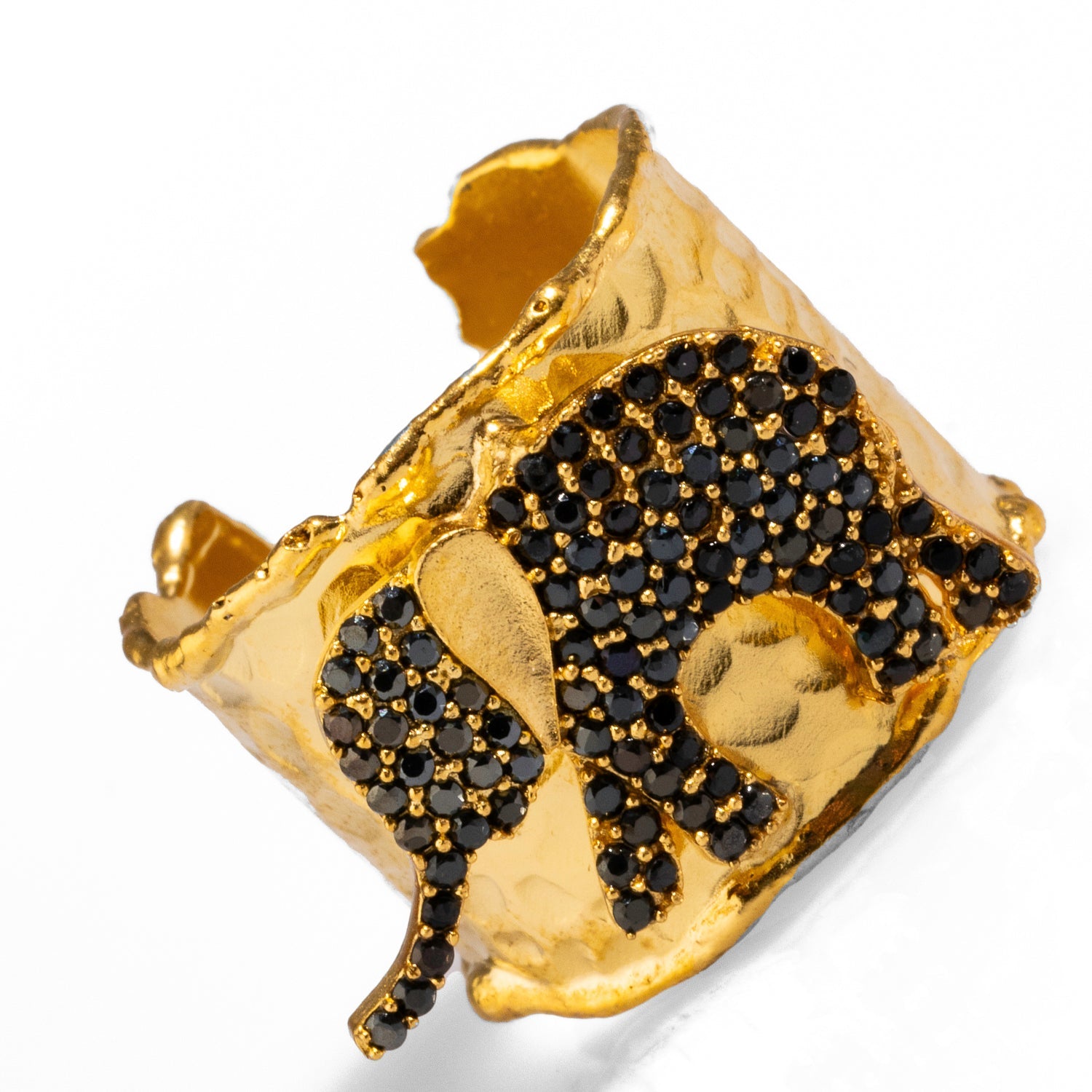 This Guardian Black Elephant Gold Cuff Adjustable Ring by Ebru Jewelry is a bold and powerful statement piece. It features a chunky cuff design with a detailed lucky elephant, a symbol of strength, wisdom, and prosperity. Adorned with shimmering black Swarovski crystals, the ring's mystique and protective energy are enhanced. The adjustable band ensures a comfortable fit, making this a meaningful and stylish addition to your collection for both everyday wear and special occasions.