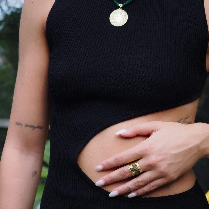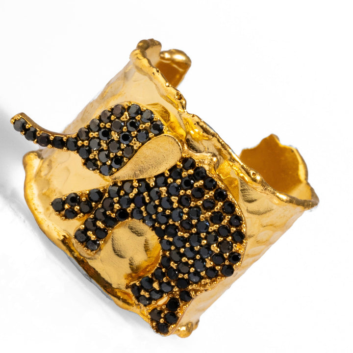 This adjustable cuff ring is crafted from high-quality brass plated with 24k gold and features black Swarovski crystals.