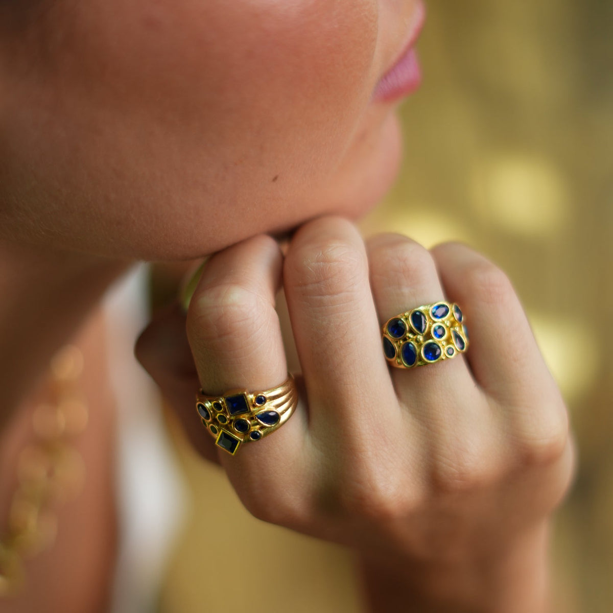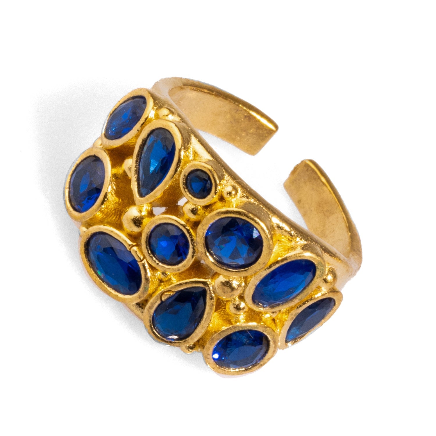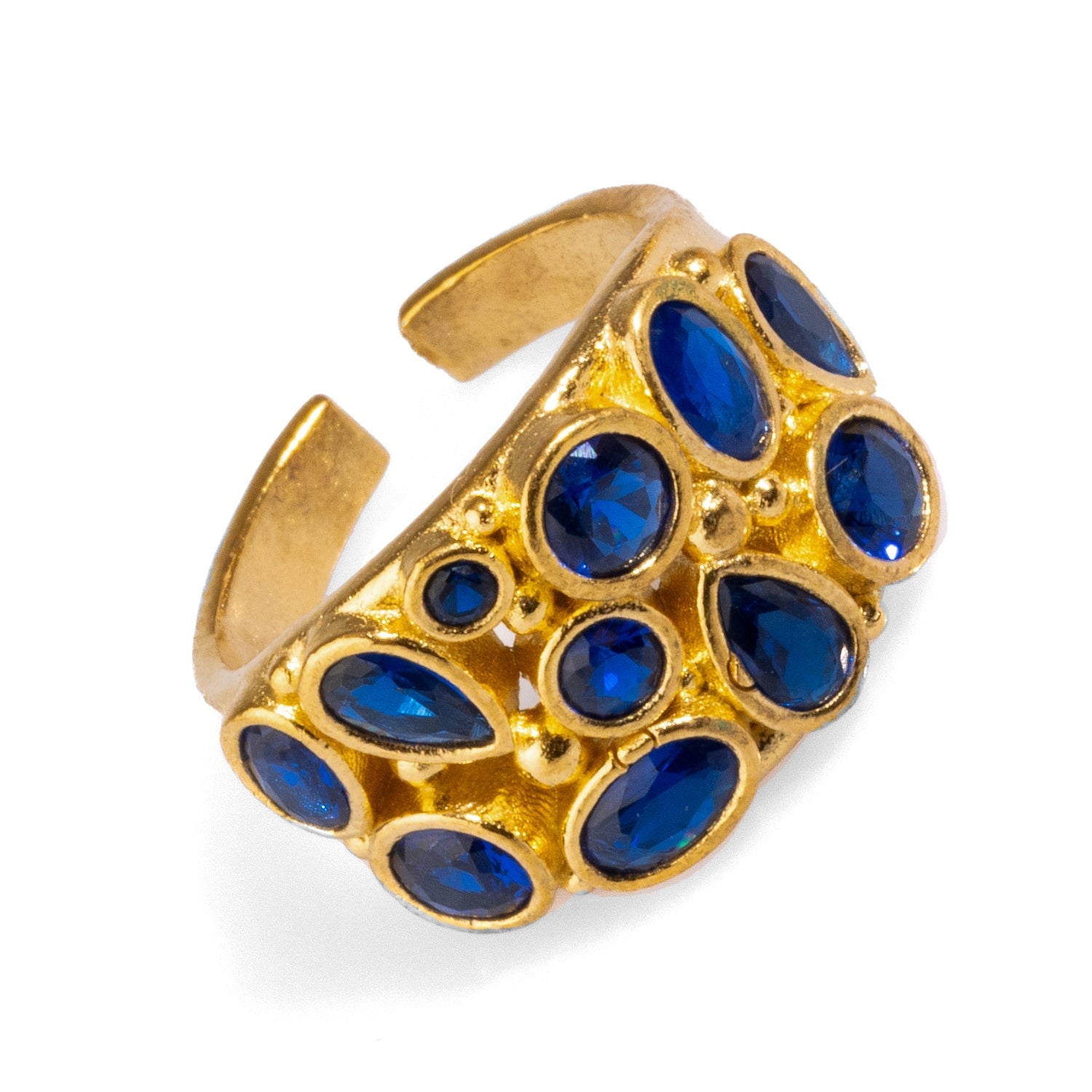 This adjustable ring is crafted from high-quality brass plated with 24k gold and is set with teardrop-shaped sapphire stones. The size is adjustable.