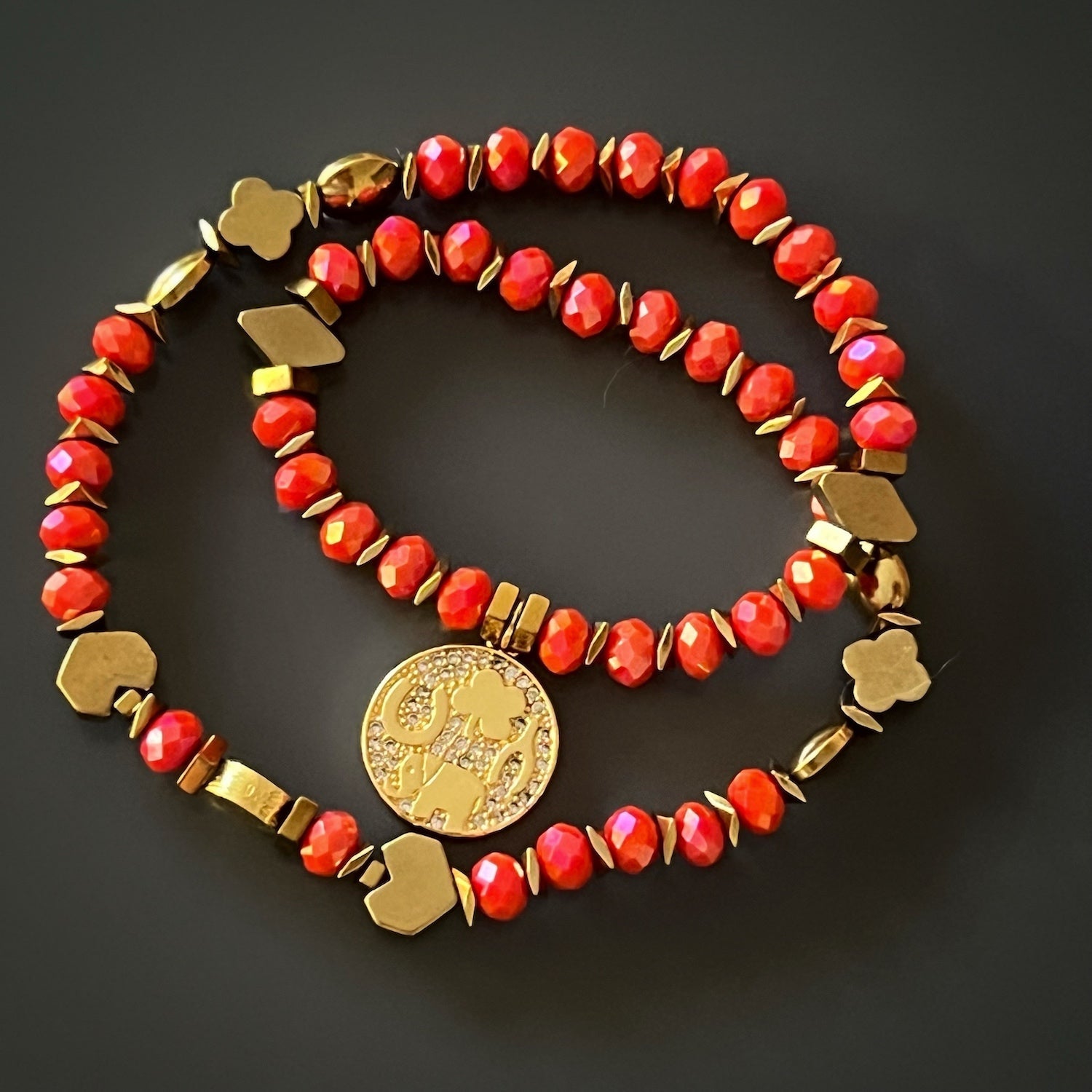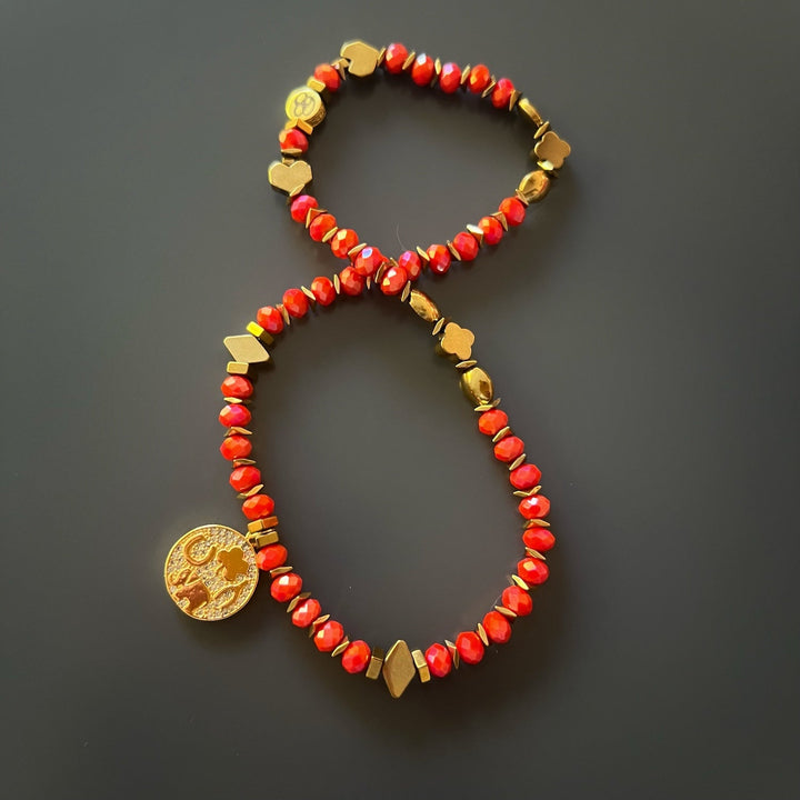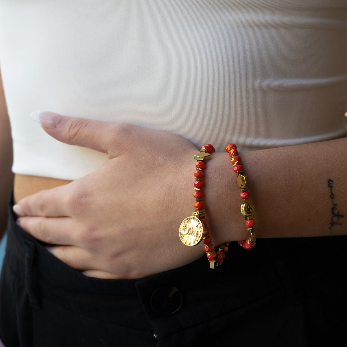 This Lucky & Protection Symbol Charm Double Beaded Red Bracelet by Ebru Jewelry is a stunning piece that combines vibrant energy with powerful symbolism. The bracelet features orange crystal beads and gold-colored hematite spacers, while the 18k gold-plated symbol charm adds a touch of elegance and luck. This handcrafted bracelet is perfect for those who want to attract joy and creativity while staying grounded.