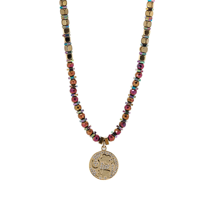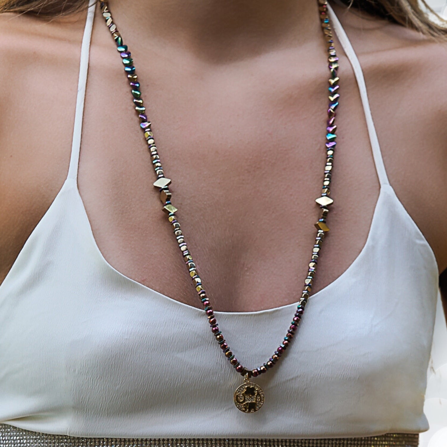 This necklace is made with multicolor heart-shaped hematite stone beads, gold-colored hematite stone beads, and an 18K gold-plated pendant with zircon stones. The necklace is 28" long, and the pendant is 0.7" high and 0.7" wide.
