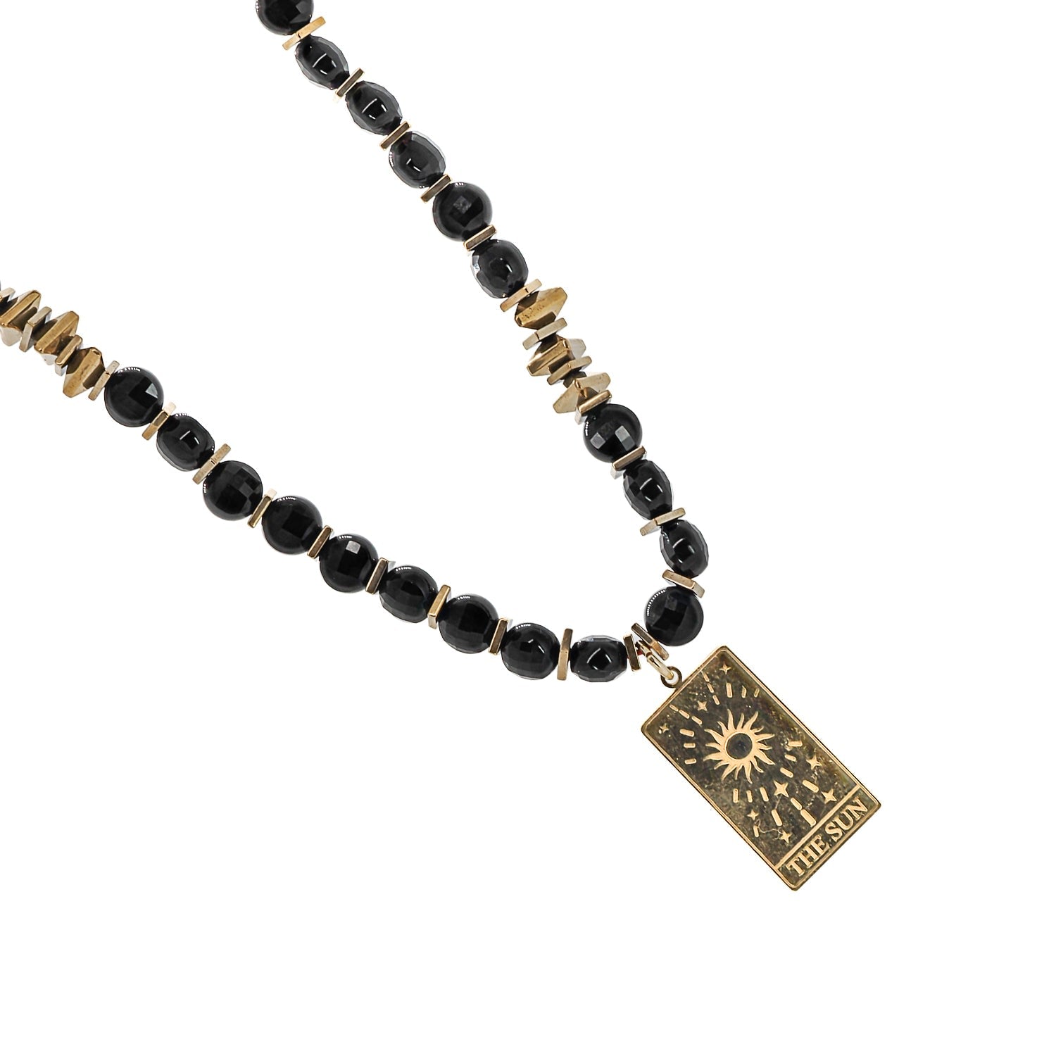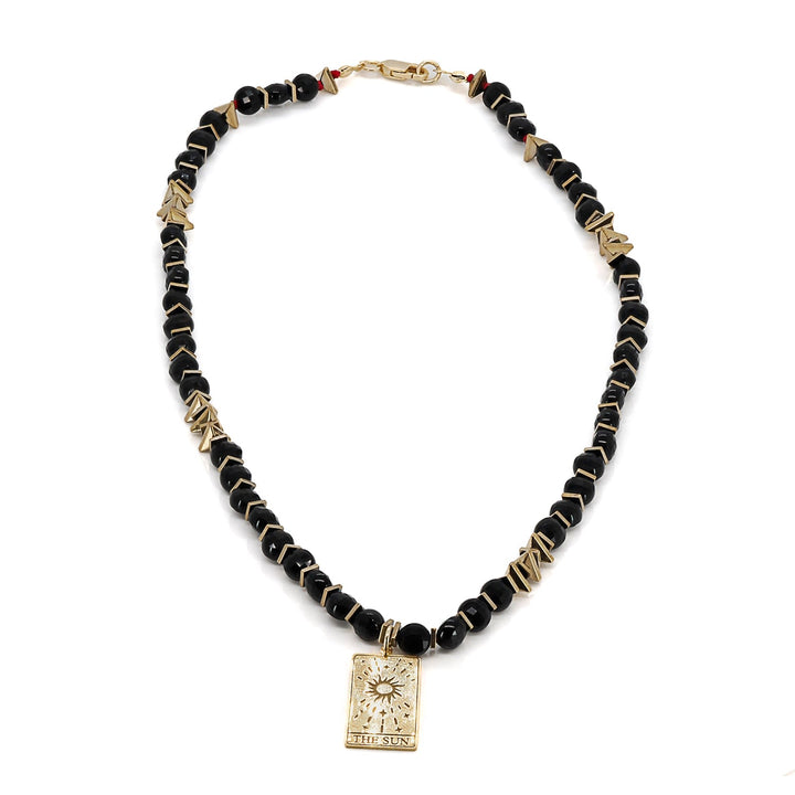 Gold Tarot Sun Card Pendant Black Onyx Stone Beaded Necklace - Gold