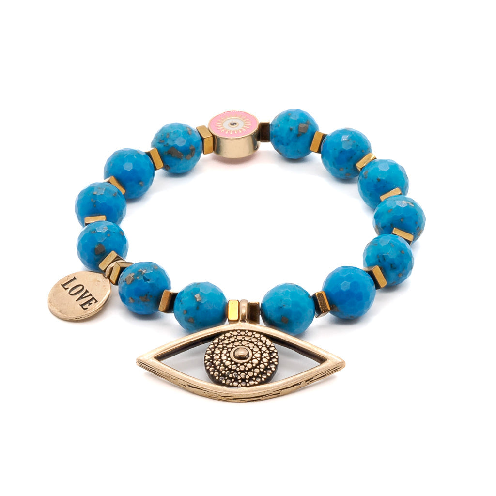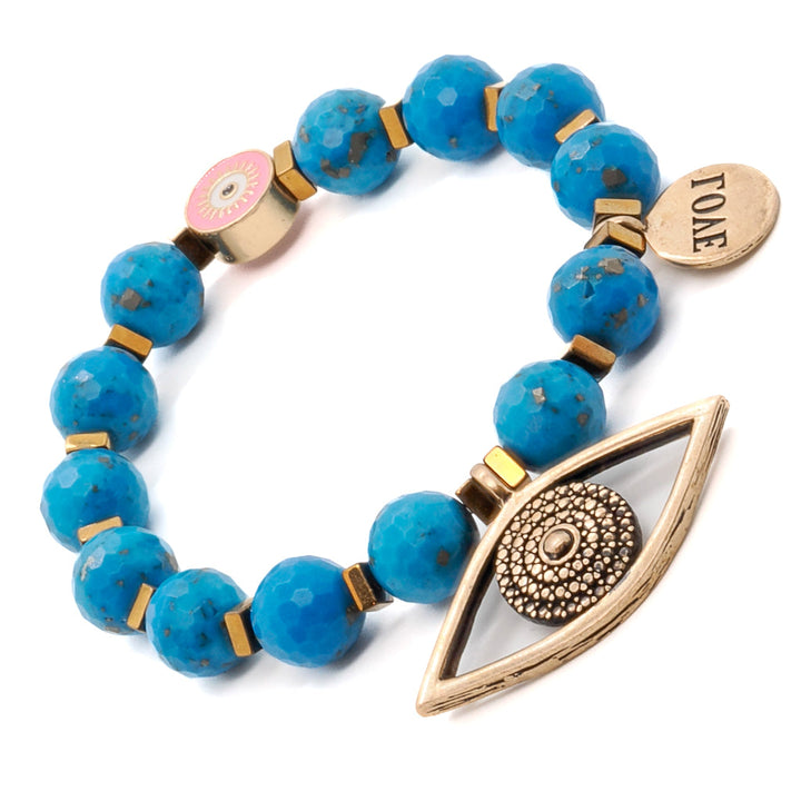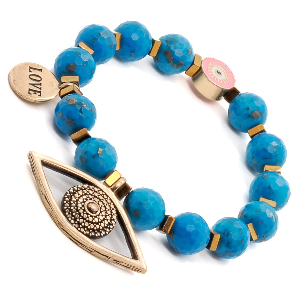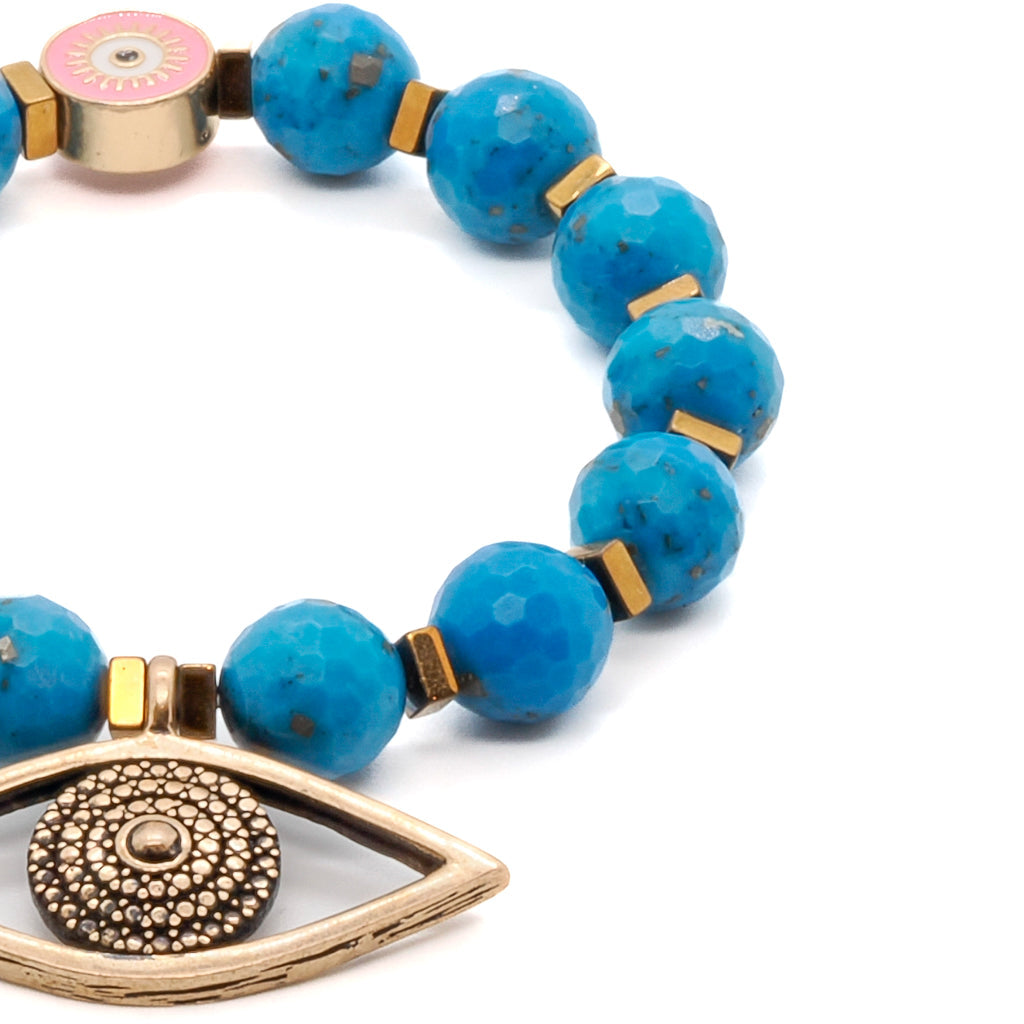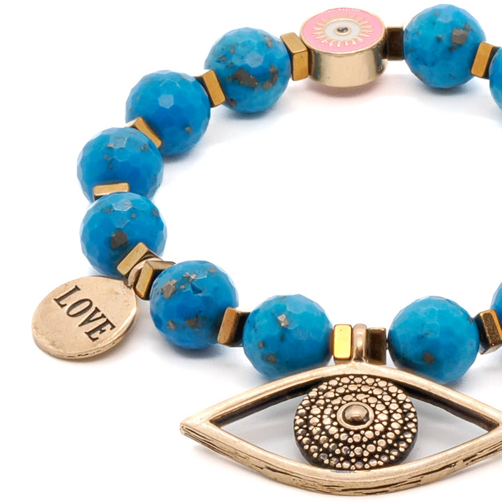 This bracelet features a gold-plated bronze evil eye charm, 10mm special faceted Turquoise stone beads with Pyrite stone, and a gold-plated evil eye accent bead. The bracelet size is 6.5".