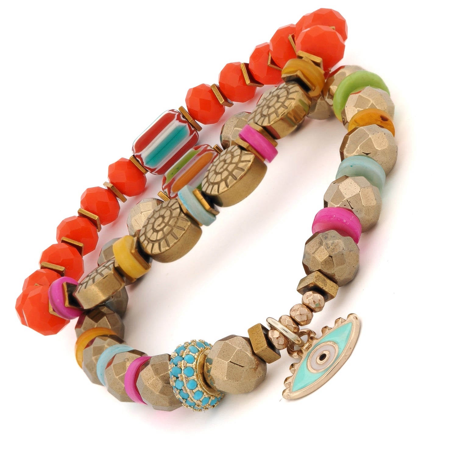 This bracelet set features an 18K gold-plated blue enamel evil eye charm, orange crystal beads, gold hematite sea shell beads, and gold hematite beads. The bracelet size is 6.5".