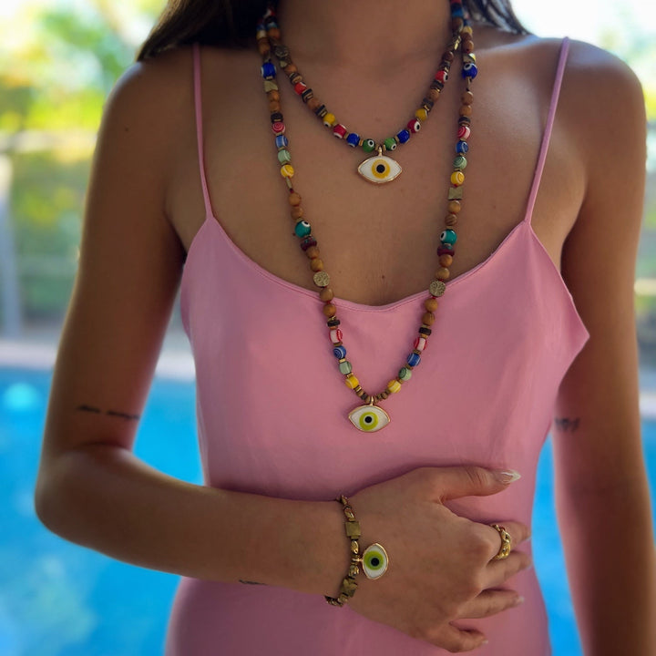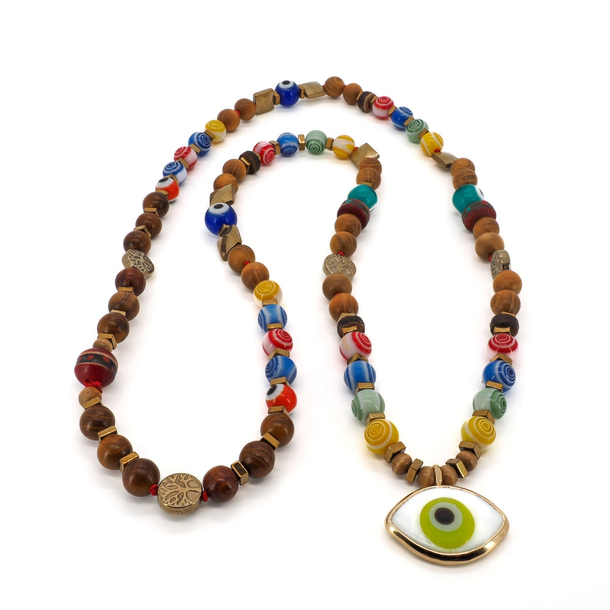 This necklace features blue, yellow, red, and green glass evil eye beads, gold hematite stone tree of life beads, and an 18K Gold plated glass evil eye pendant. The necklace length is 31".