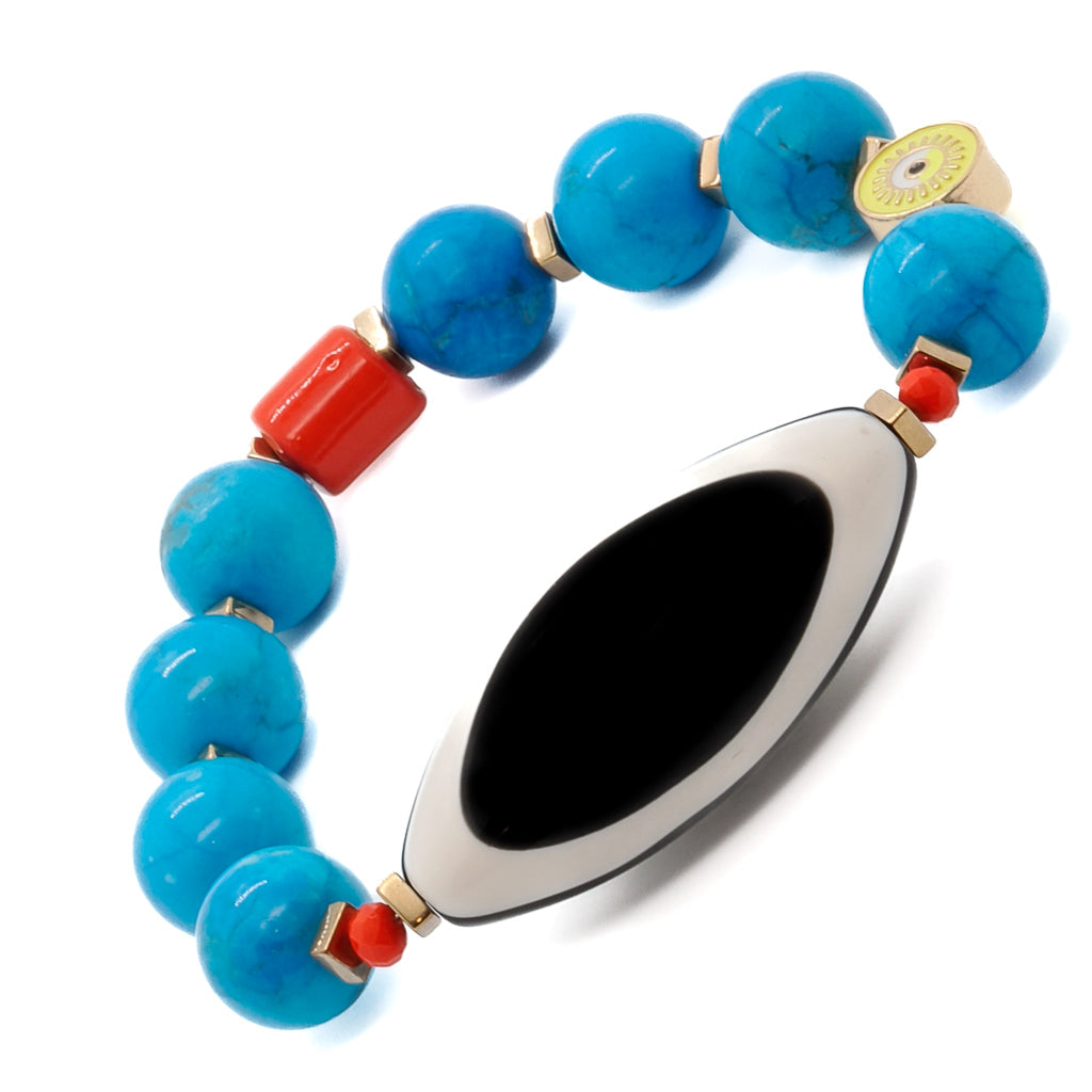 This Happiness Turquoise Eye Bracelet by Ebru Jewelry is a fun and colorful accessory designed to bring good luck and inner calm. The vibrant design includes natural Turquoise beads, a large black and white Evil Eye bead, and an 18k gold-plated yellow enamel evil eye bead. This bracelet is perfect for dispelling negative energy and attracting romantic love and friendship.