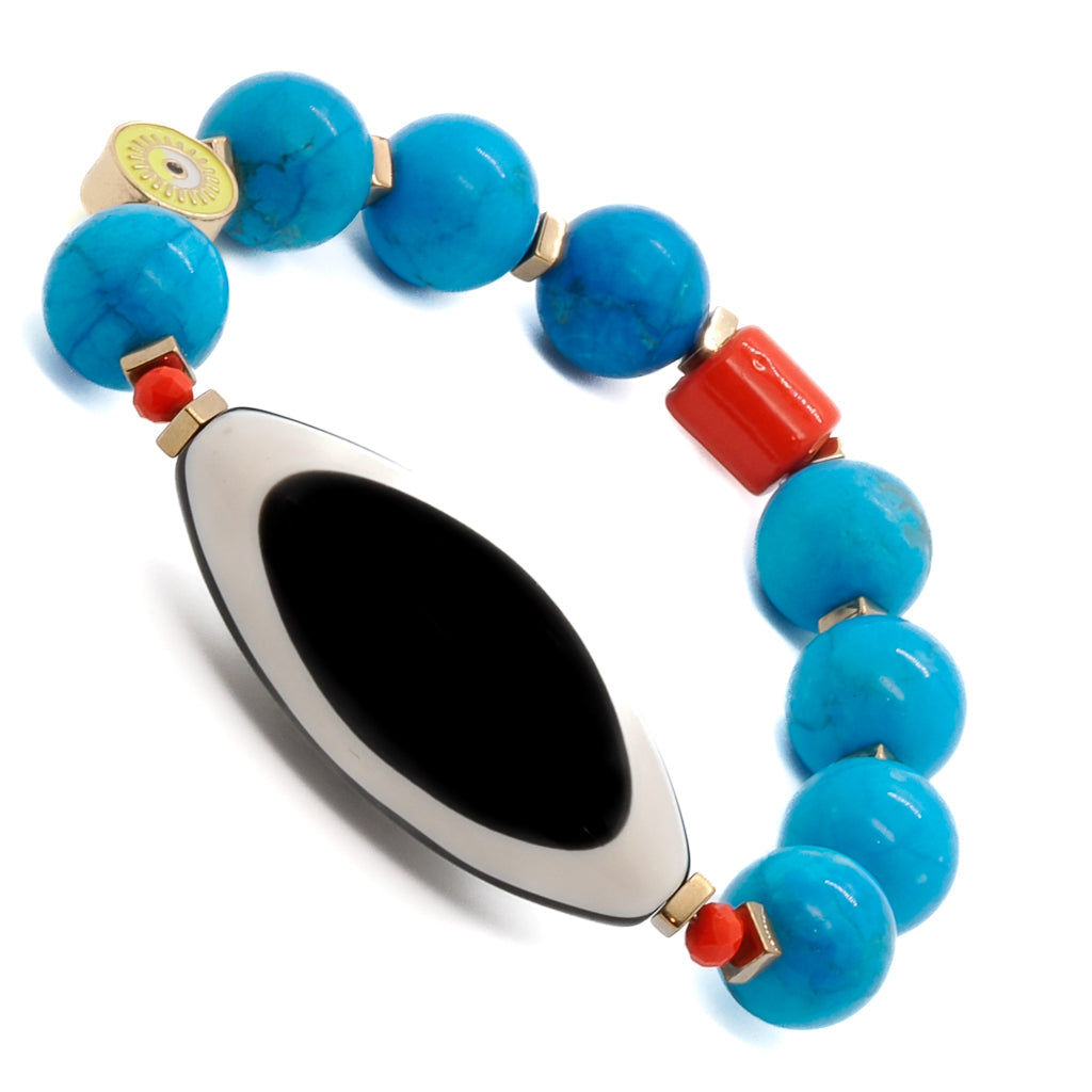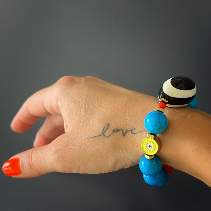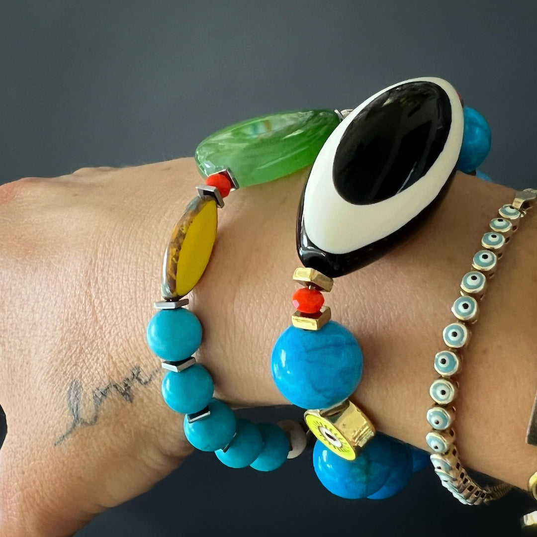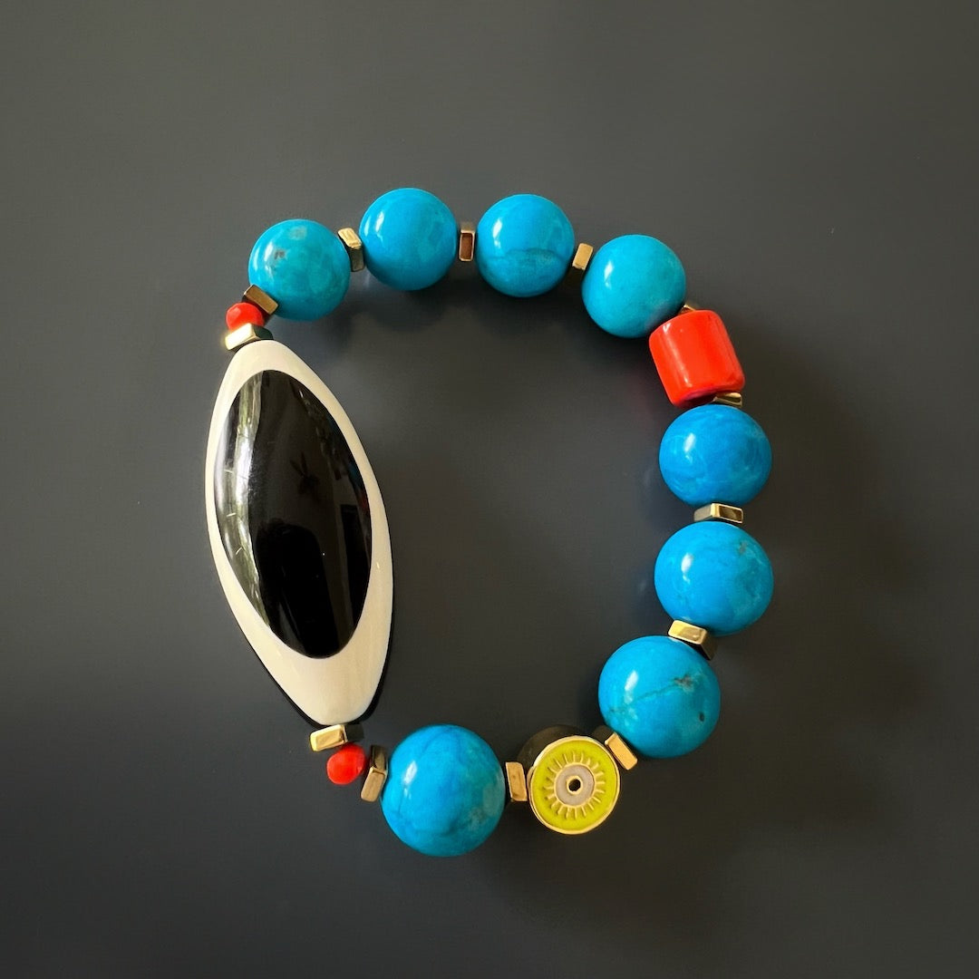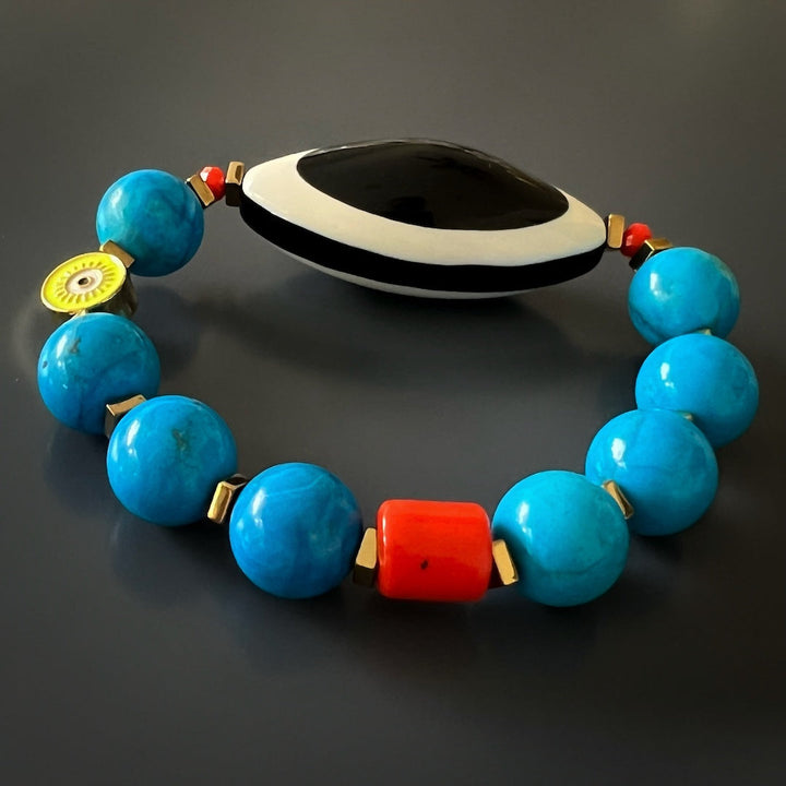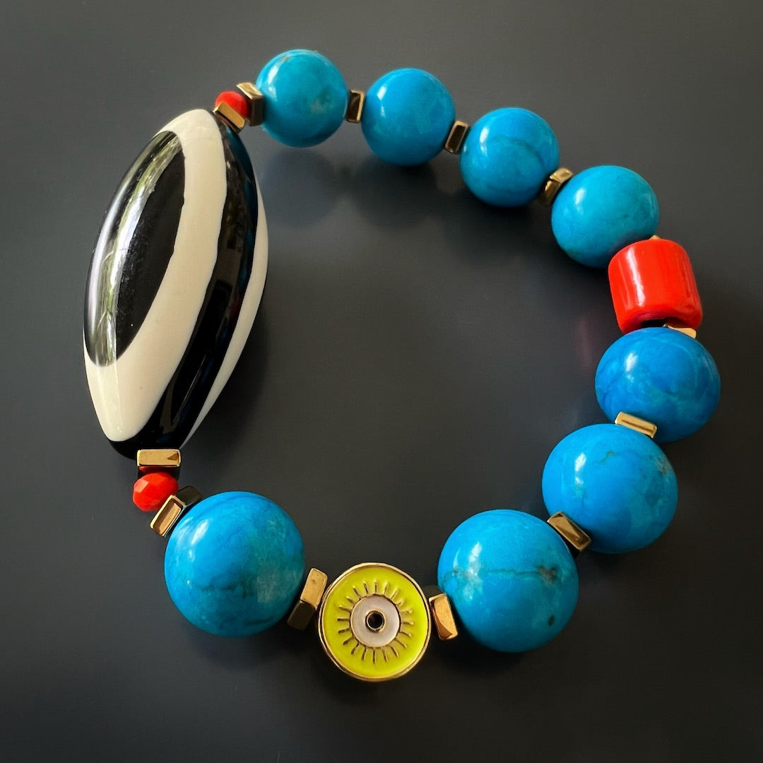 This bracelet features 12mm natural Turquoise beads, an orange color African bead, a black and white Nepal Evil Eye Resin Bead, an 18k gold-plated yellow enamel evil eye bead, and gold-colored hematite stone spacers. The bracelet size is 6.5" on a stretchy jewelry cord.