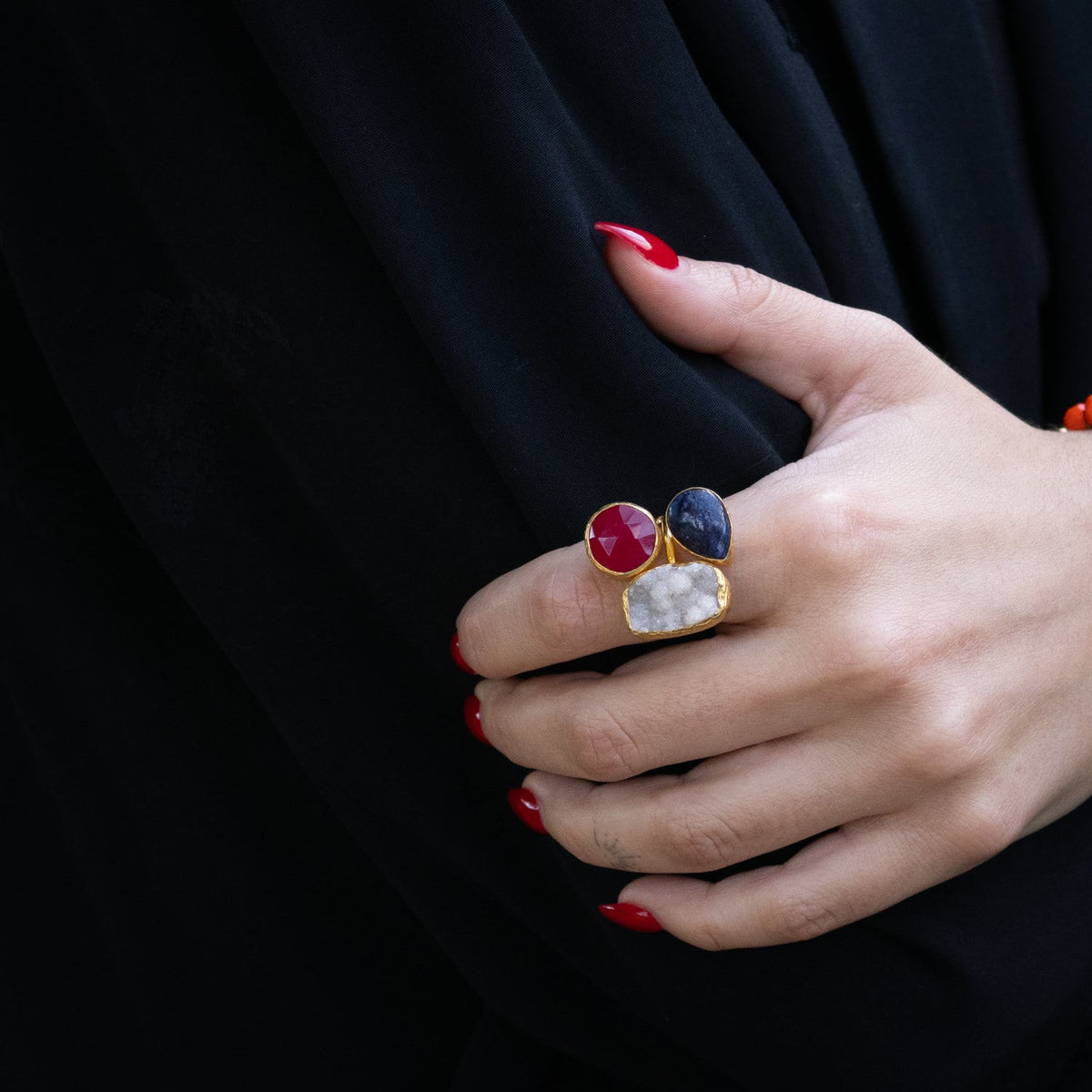 The Energized Harmony Ruby, Quartz & Amethyst Adjustable Gemstone Ring by Ebru Jewelry is a striking statement piece. It combines the fiery energy of ruby, the clarity of quartz, and the soothing properties of amethyst. Set in 24K gold-plated bronze, this handcrafted ring features a bold, asymmetrical design that celebrates the beauty of natural imperfection and energetic balance.