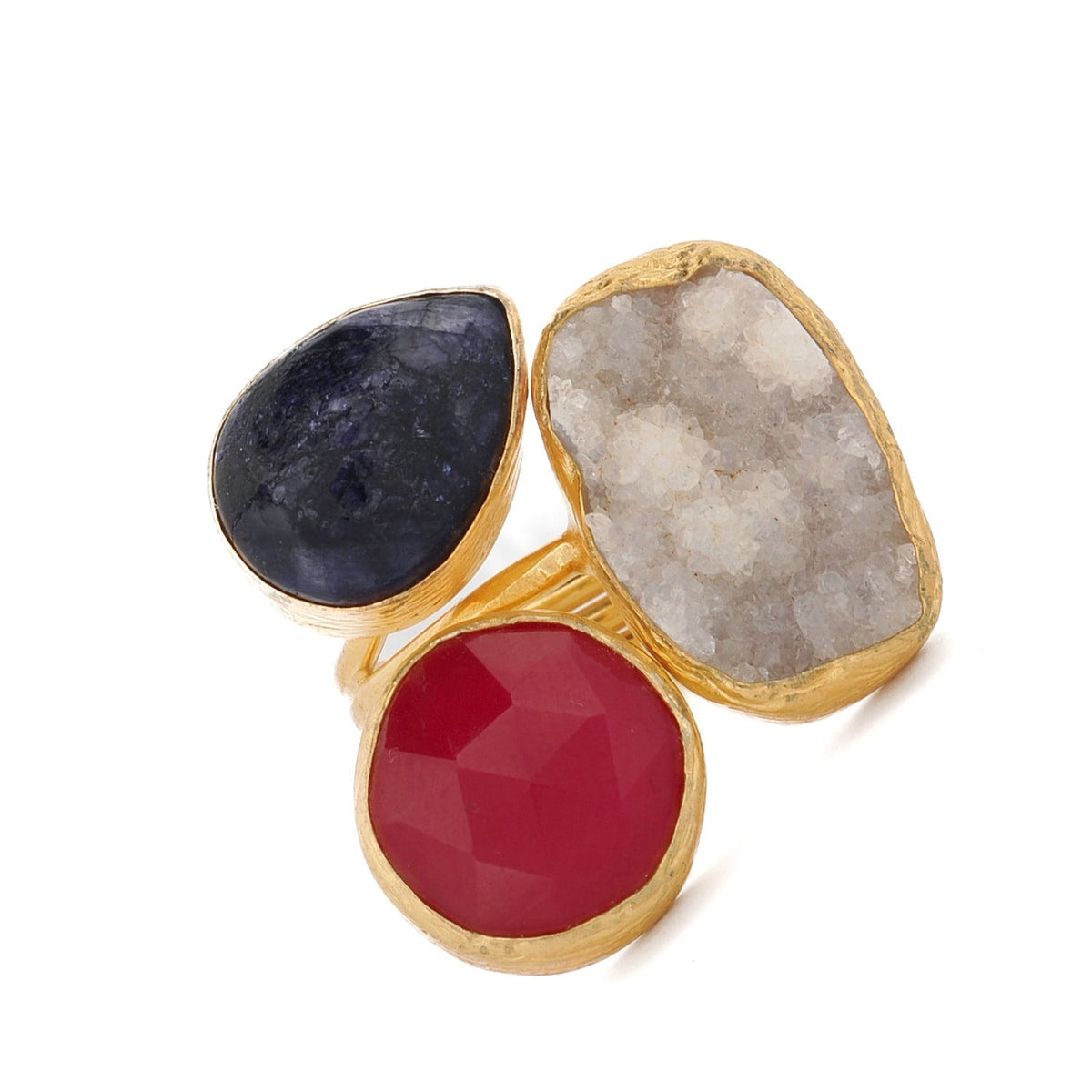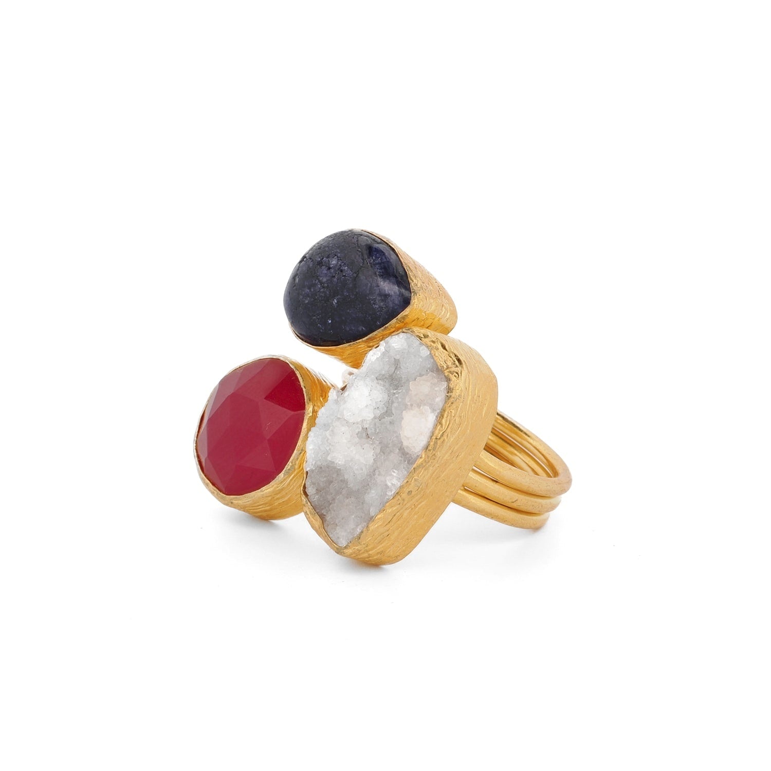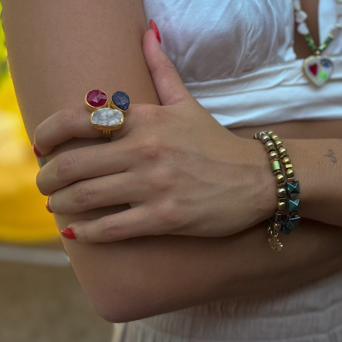 This ring is made with natural ruby, quartz, and amethyst stones and a 24K gold-plated bronze adjustable band.