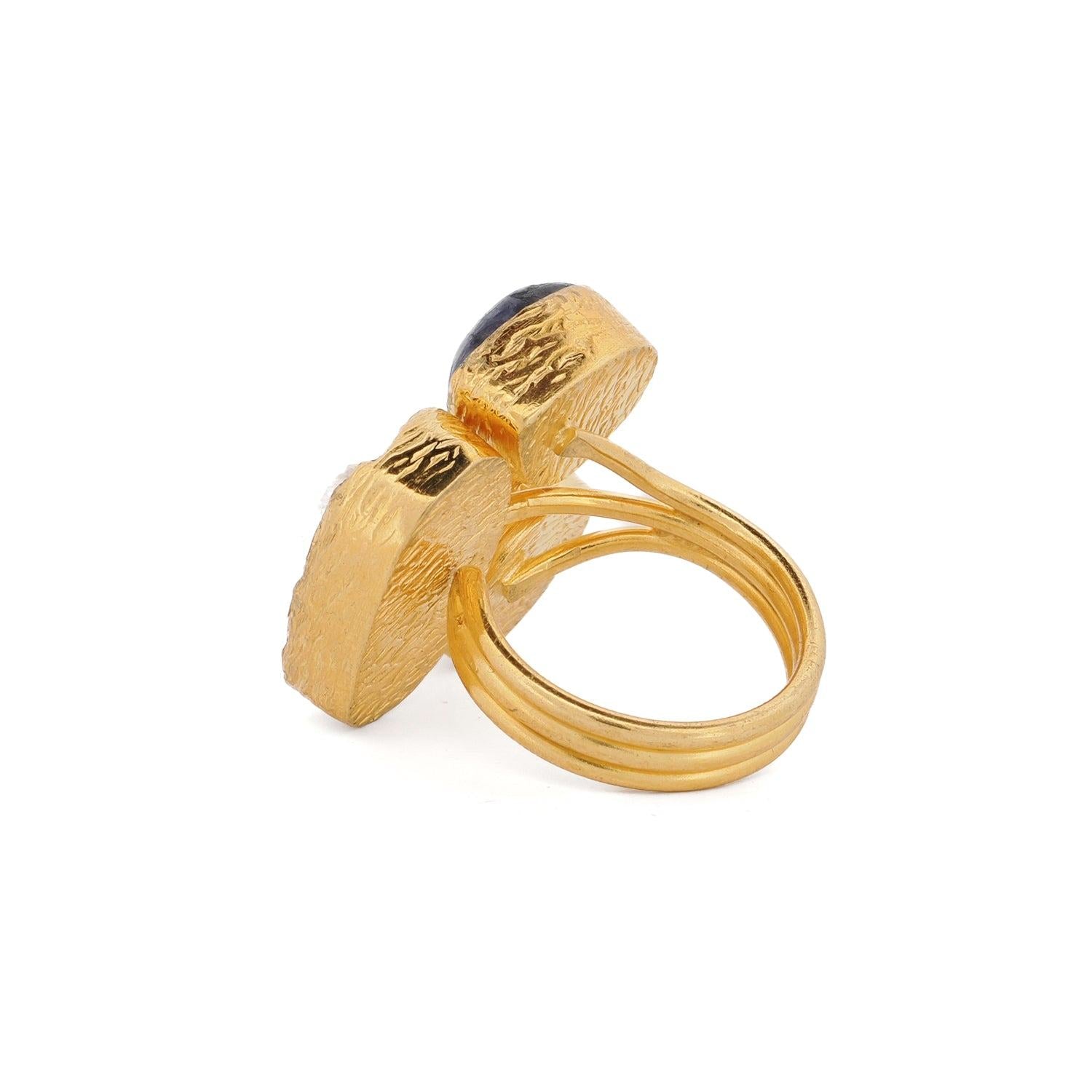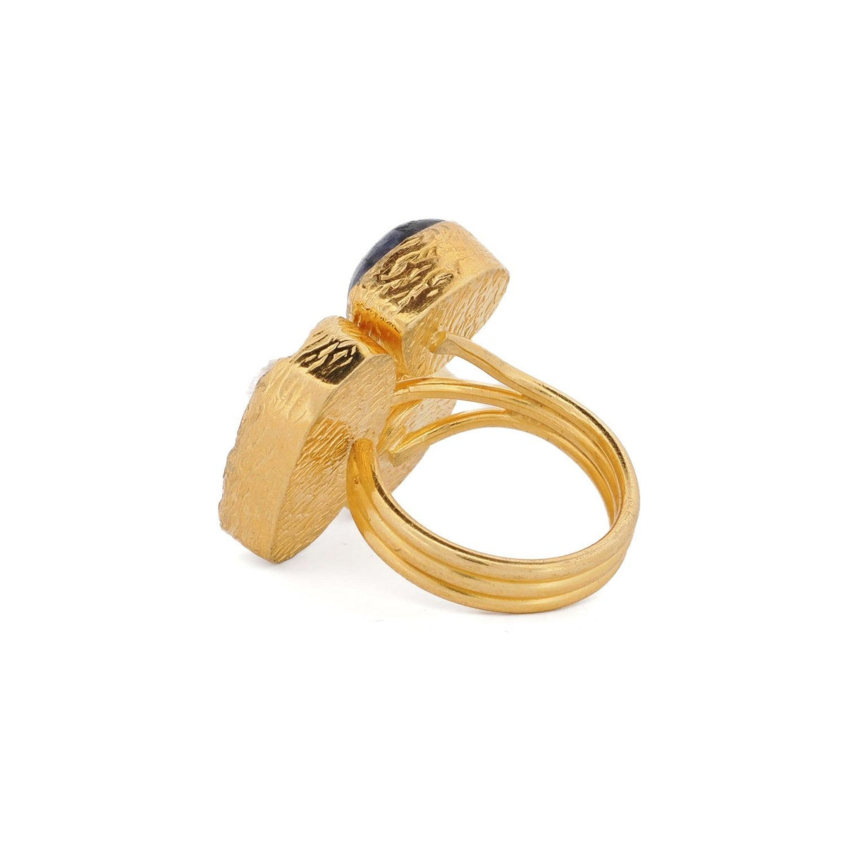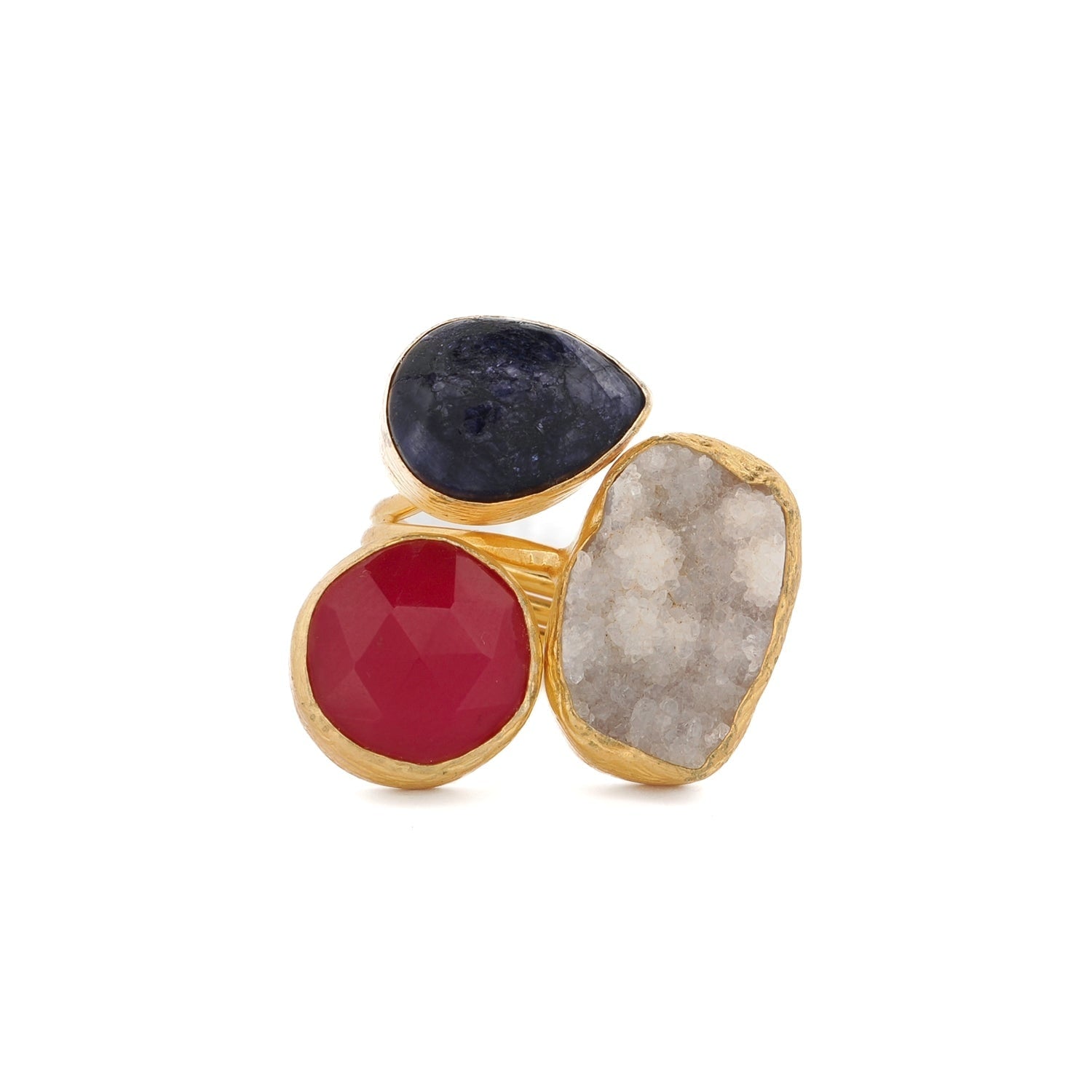 This ring is made with natural ruby, quartz, and amethyst stones and a 24K gold-plated bronze adjustable band.