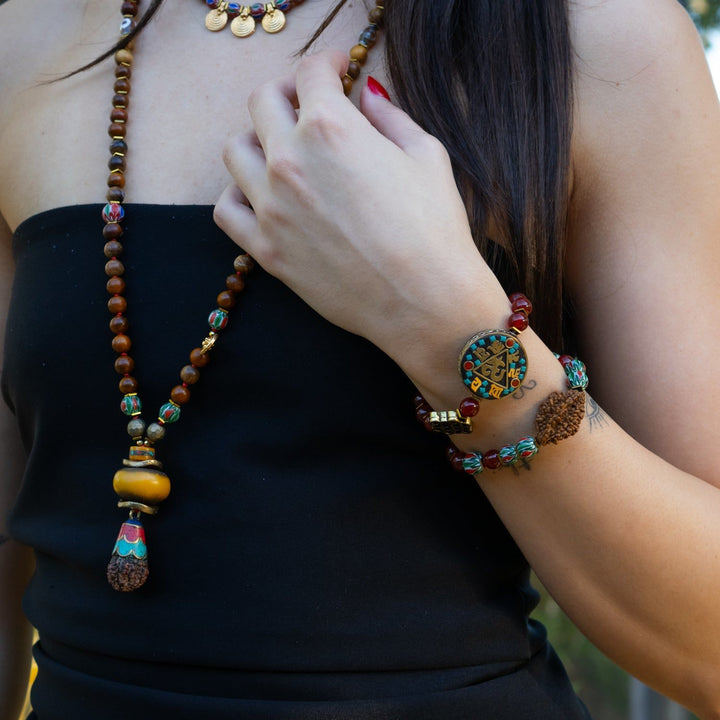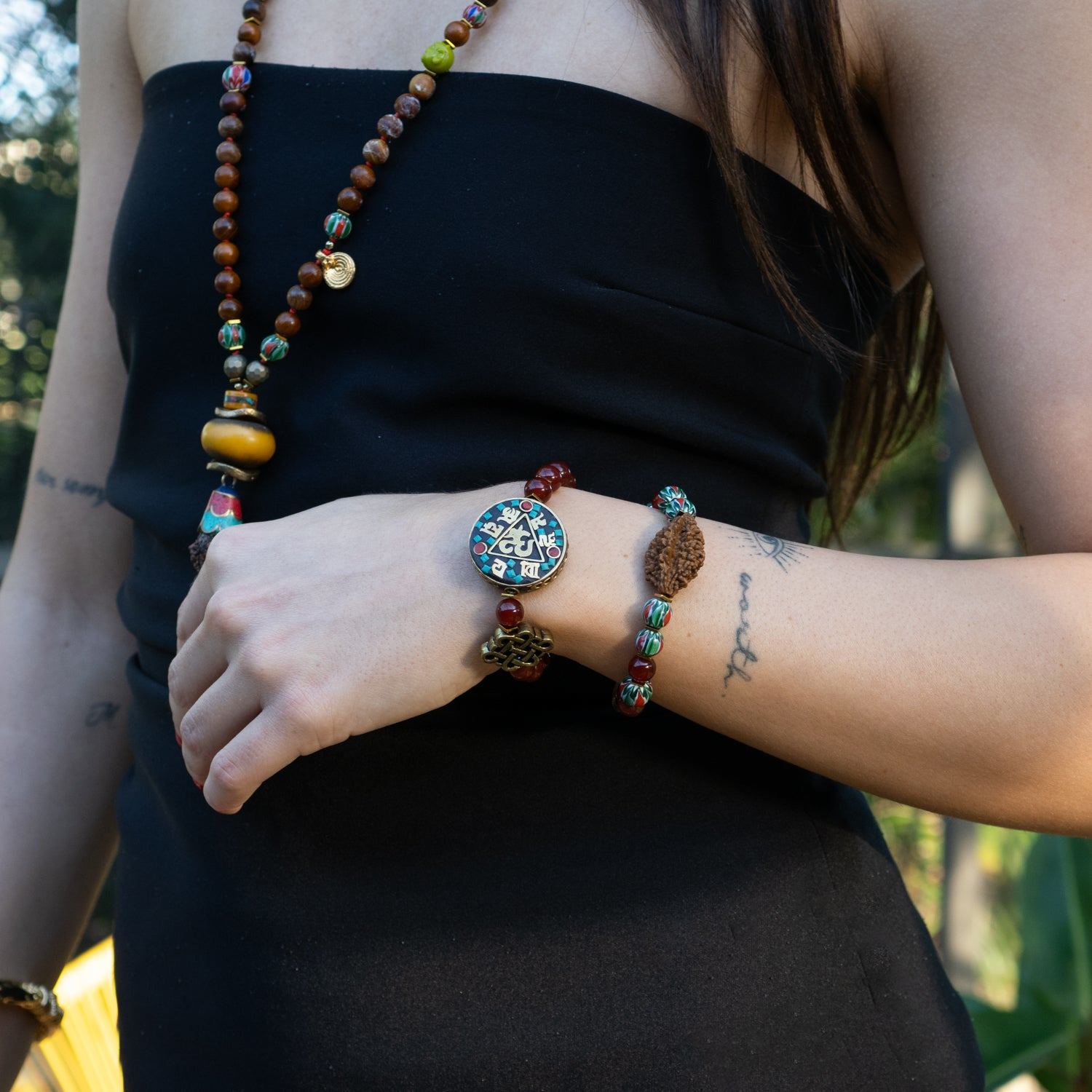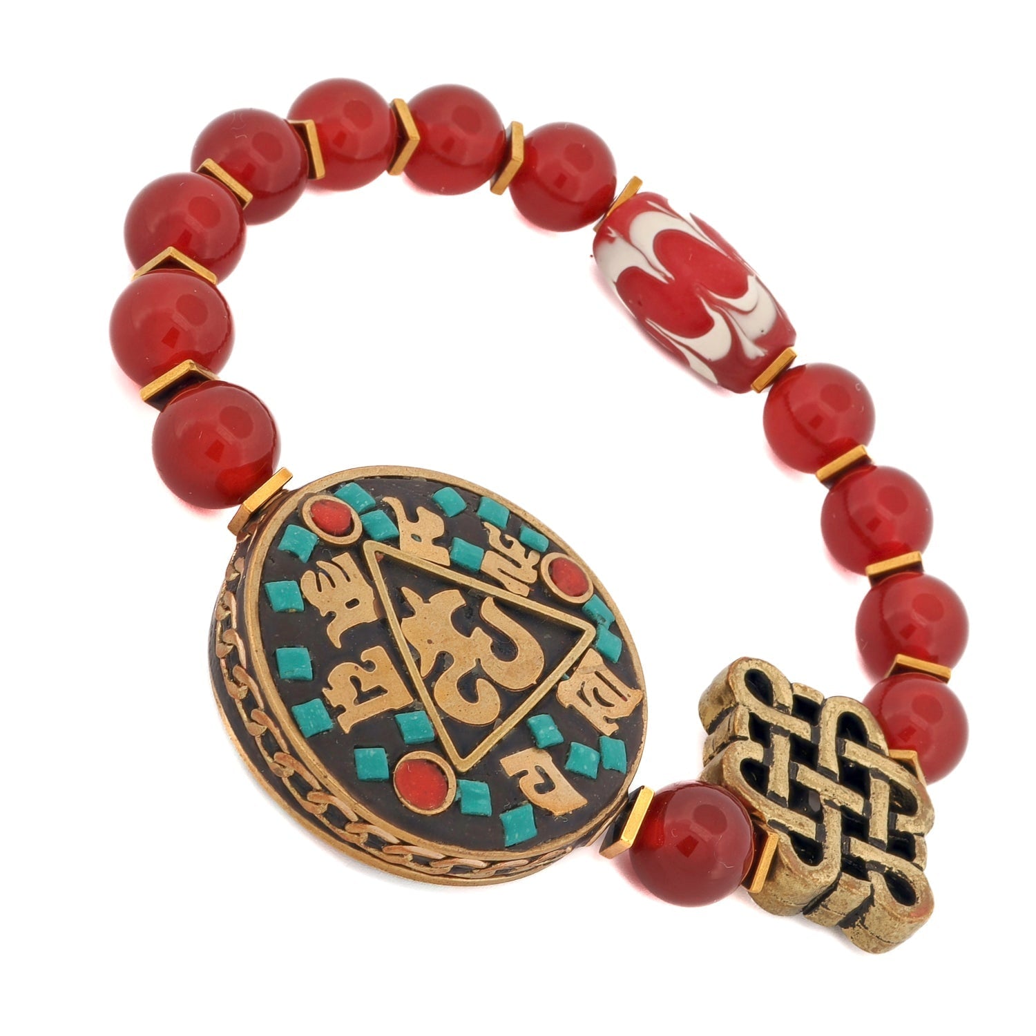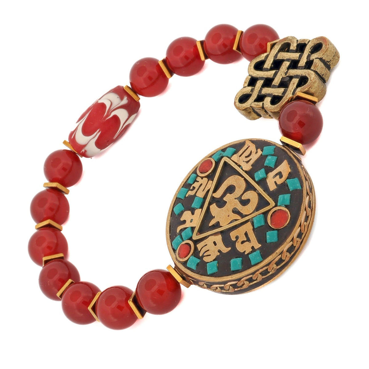 This bracelet is made with an antique Tibetan bead with Om symbol, natural red carnelian stones, a gold-plated healing knot symbol bead, and a red-and-white patterned ceramic bead. It has a bracelet size of 6.5".