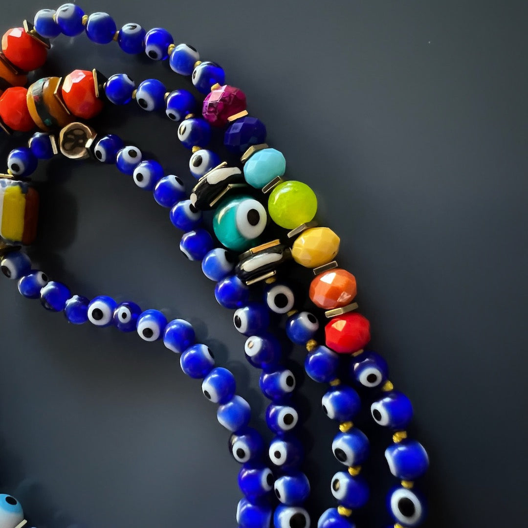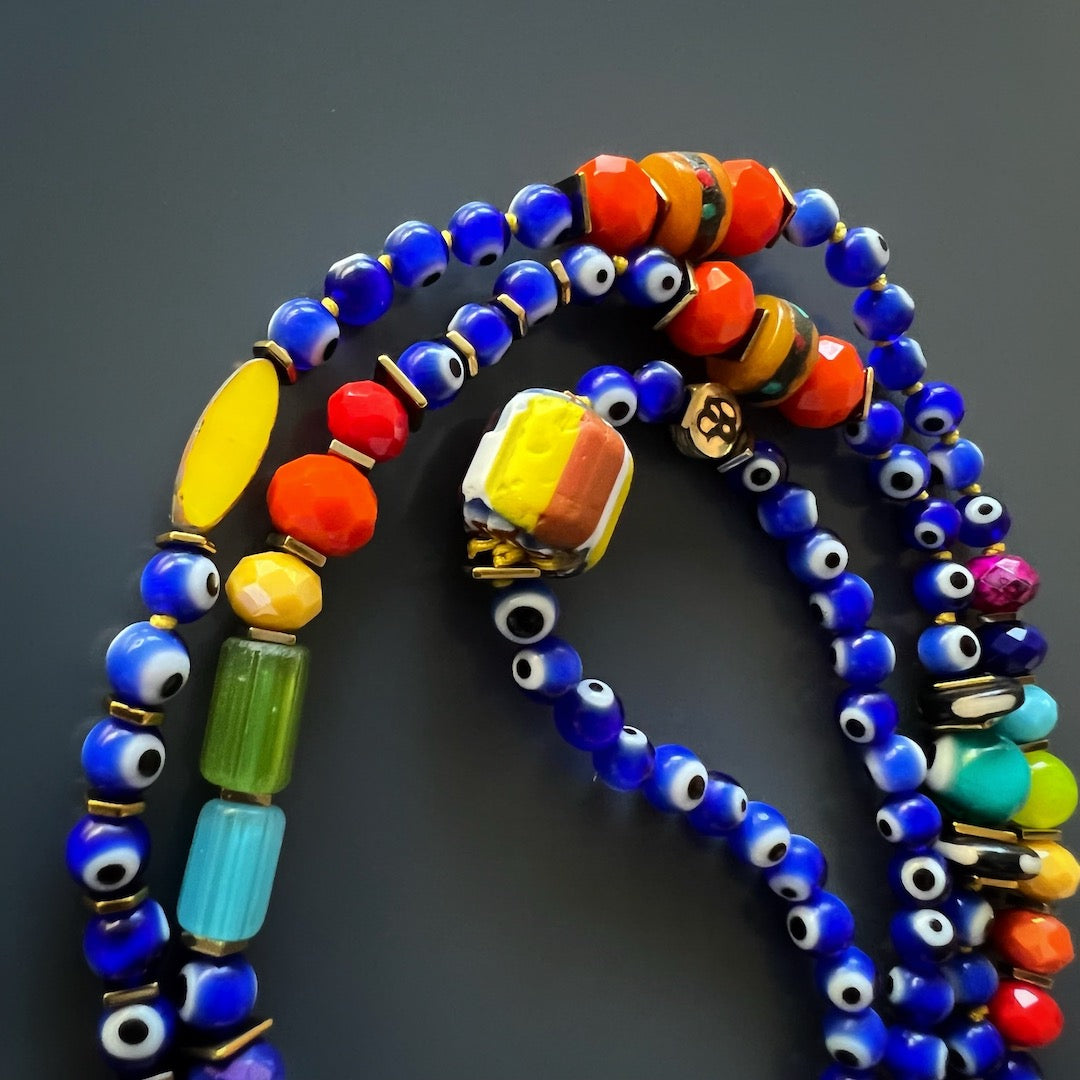 The Chakra Colors Meditation Pendant Evil Eye Beaded Mala Necklace by Ebru Jewelry is spiritually powerful and protective. This handmade necklace is perfect for meditation, featuring evil eye beads and a chakra yoga pendant. The combination of colorful African beads, Nepal meditation beads, and faceted crystals brings intense spiritual energy and healing.
