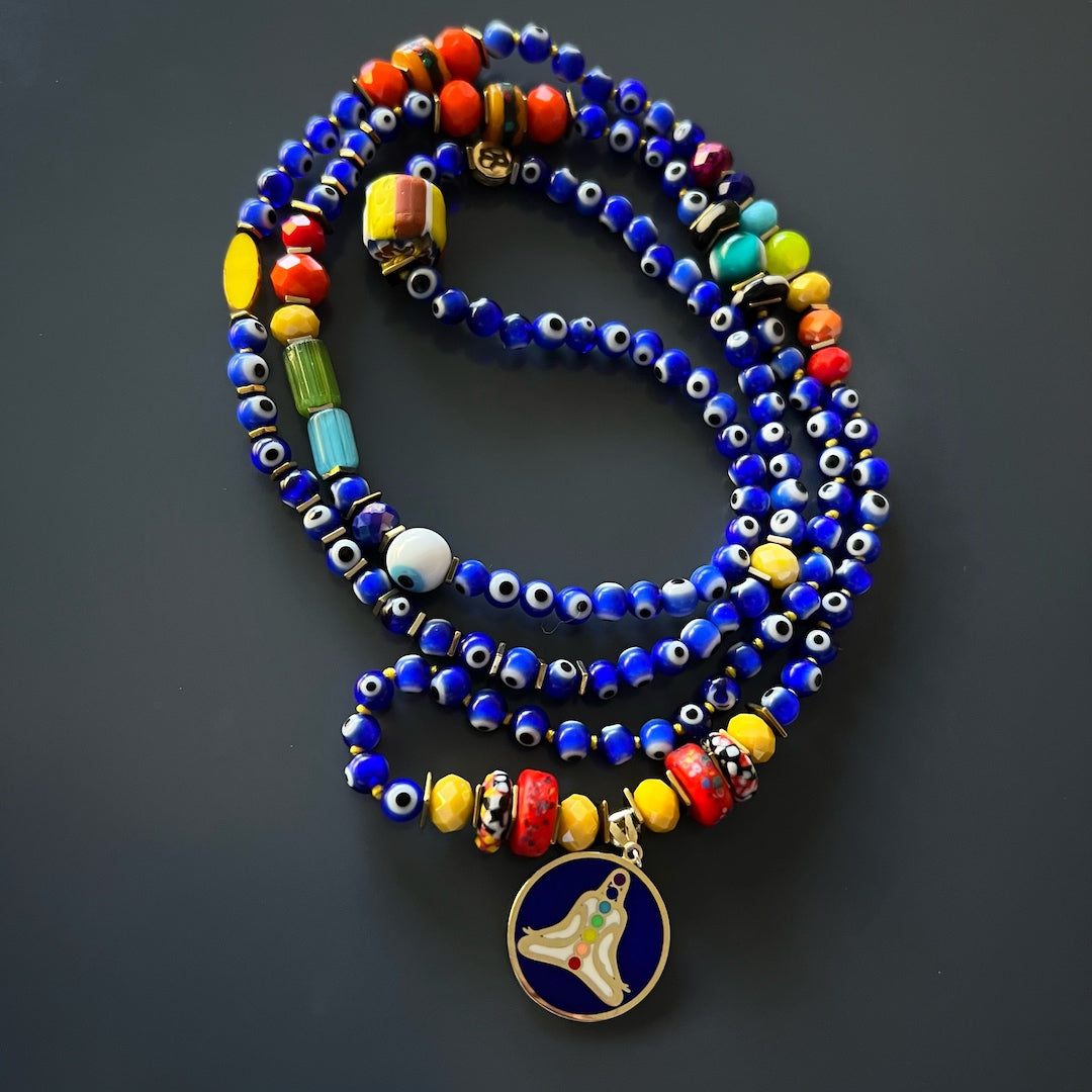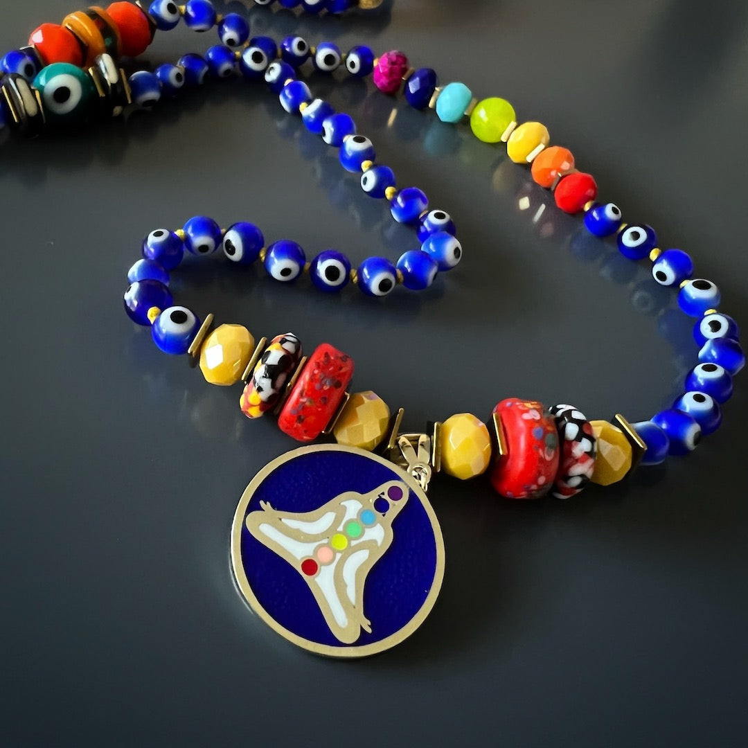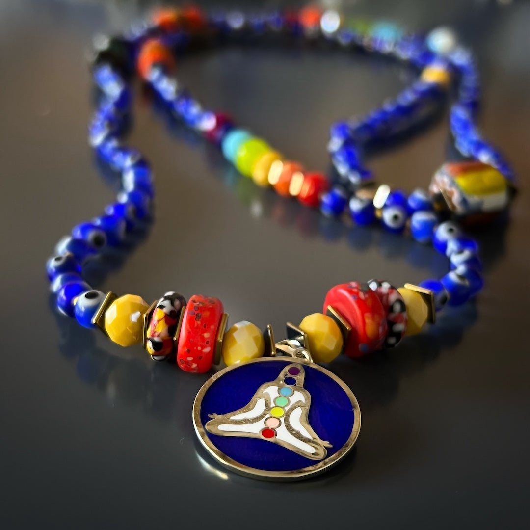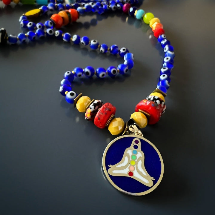 This necklace is made with glass evil eye beads, colorful African beads, Nepal meditation beads, colorful faceted crystal beads, and a silver 14k gold plated chakra yoga pendant with colorful enamel. The necklace length is 40".