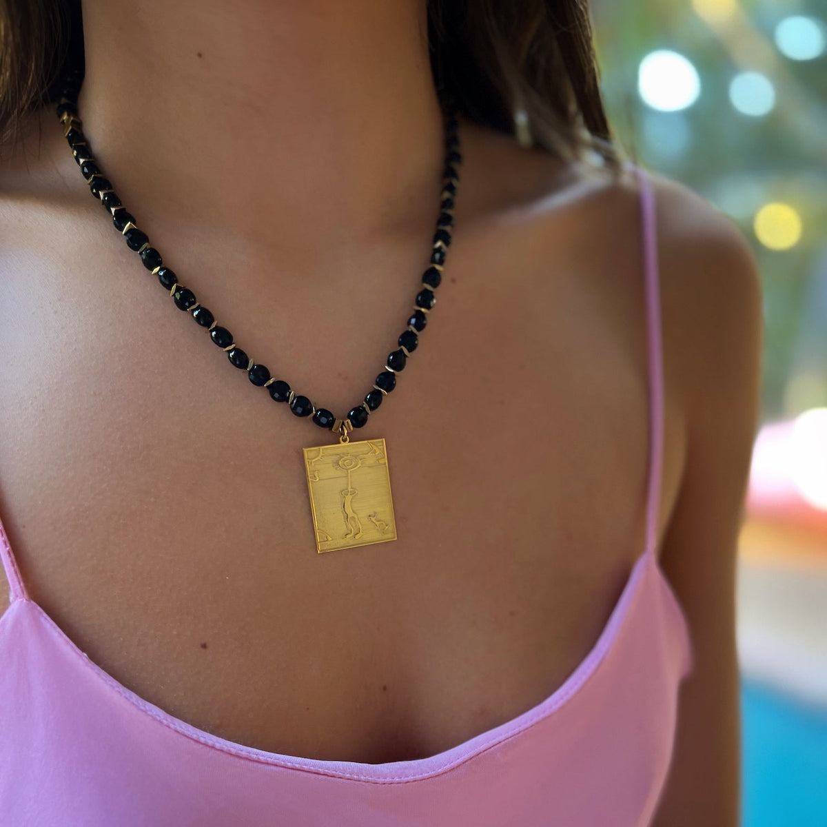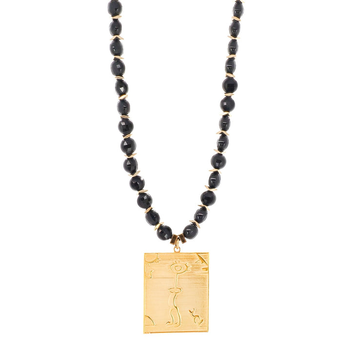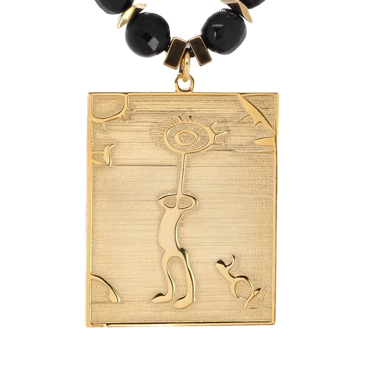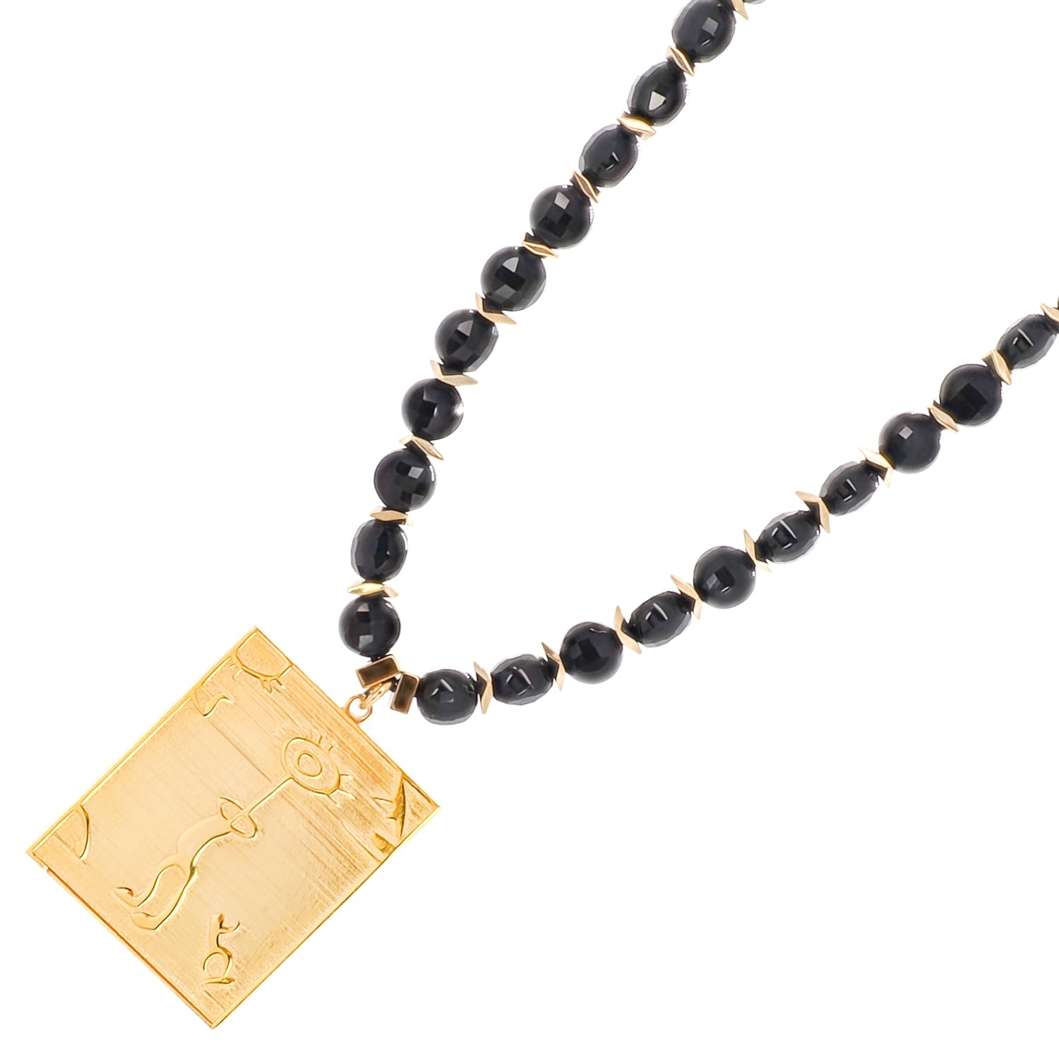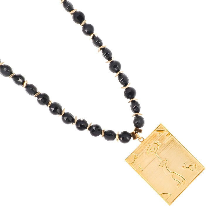 The Healer Spiral Sun Shamanic Pendant Black Agate Beaded Necklace by Ebru Jewelry is a meaningful and eye-catching handmade piece. It combines black agate stone beads, known for their grounding and protective properties, with a 18k gold plated Native American Shaman symbols pendant. It's a unique accessory that is sure to make a statement.