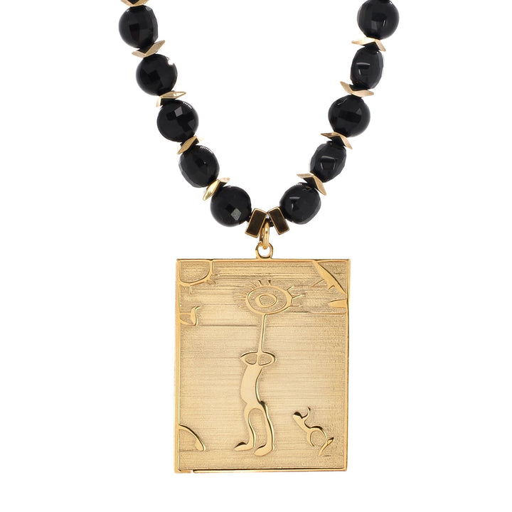 Healer Spiral Sun Shamanic Pendant Black Agate Beaded Necklace - Gold