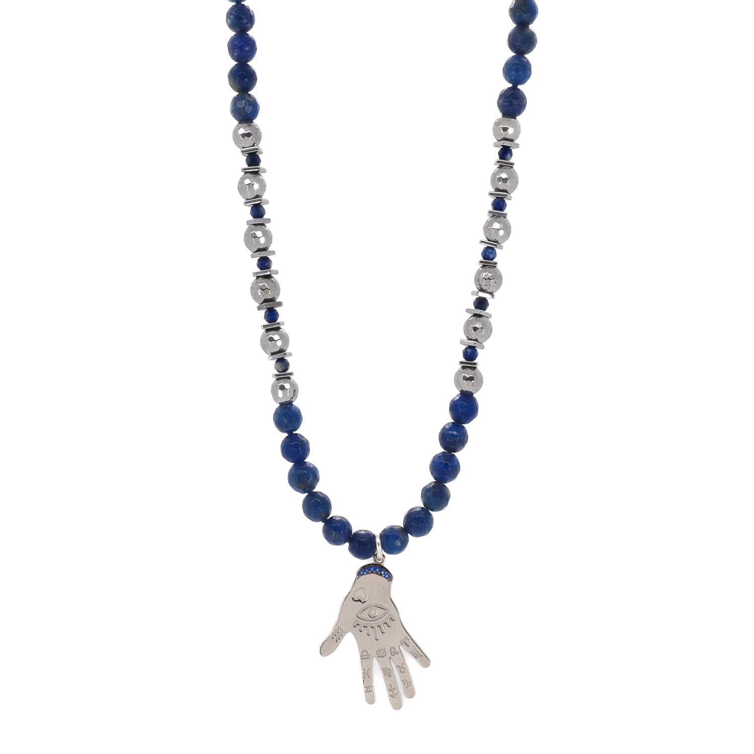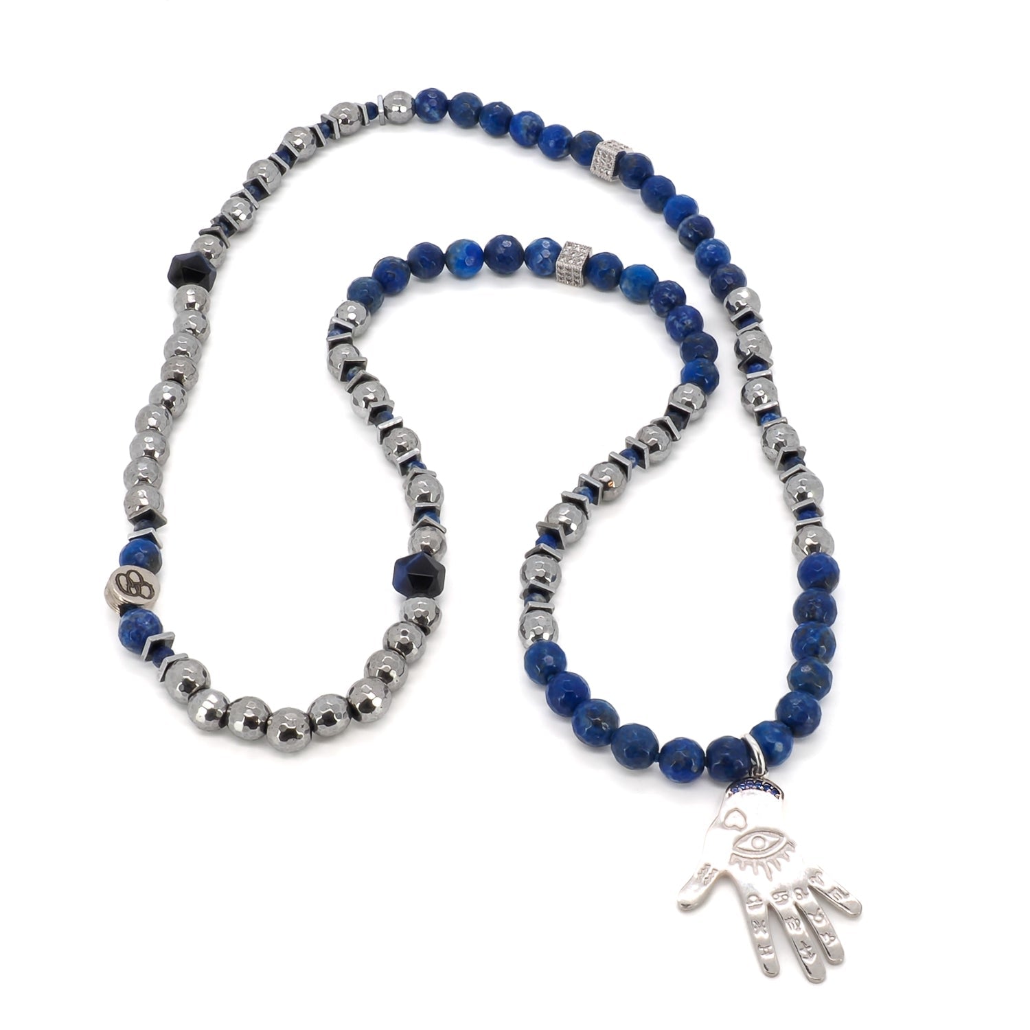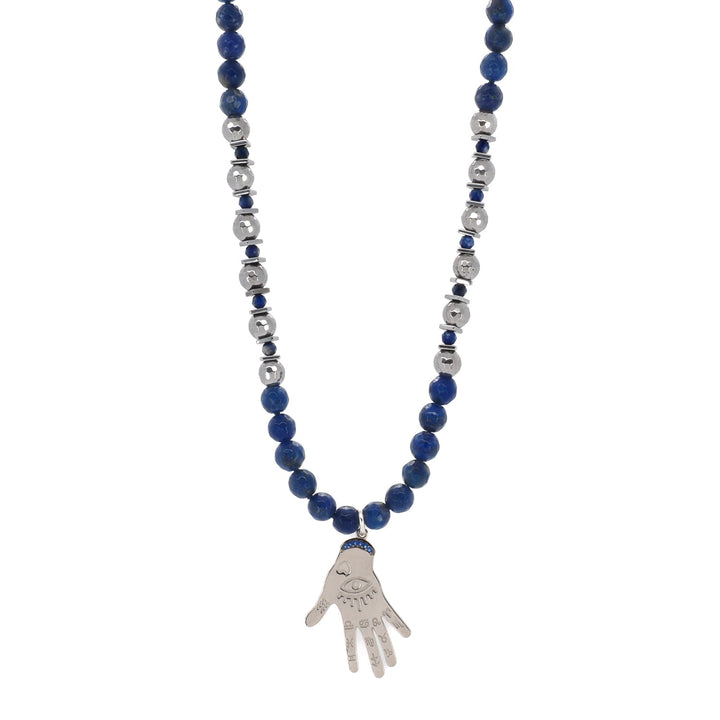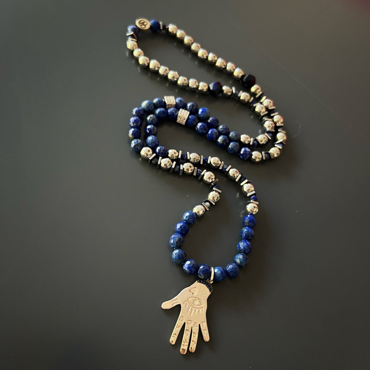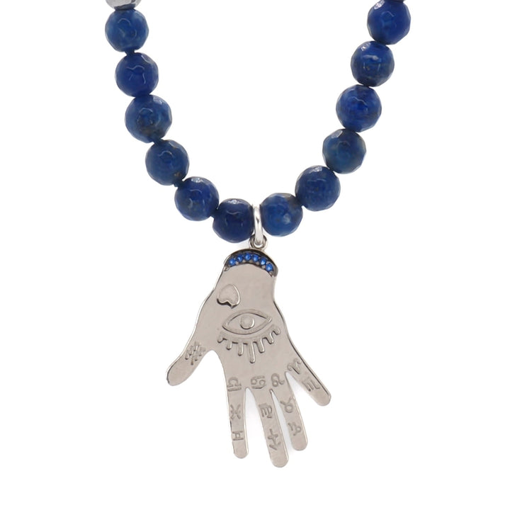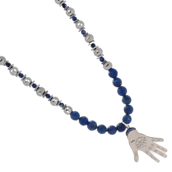 This necklace features a Sterling silver Hamsa pendant with blue Swarovski crystals. The beaded chain is made with Faceted Lapis Lazuli stone, Silver hematite stone, and Blue Tiger's Eye stone beads.