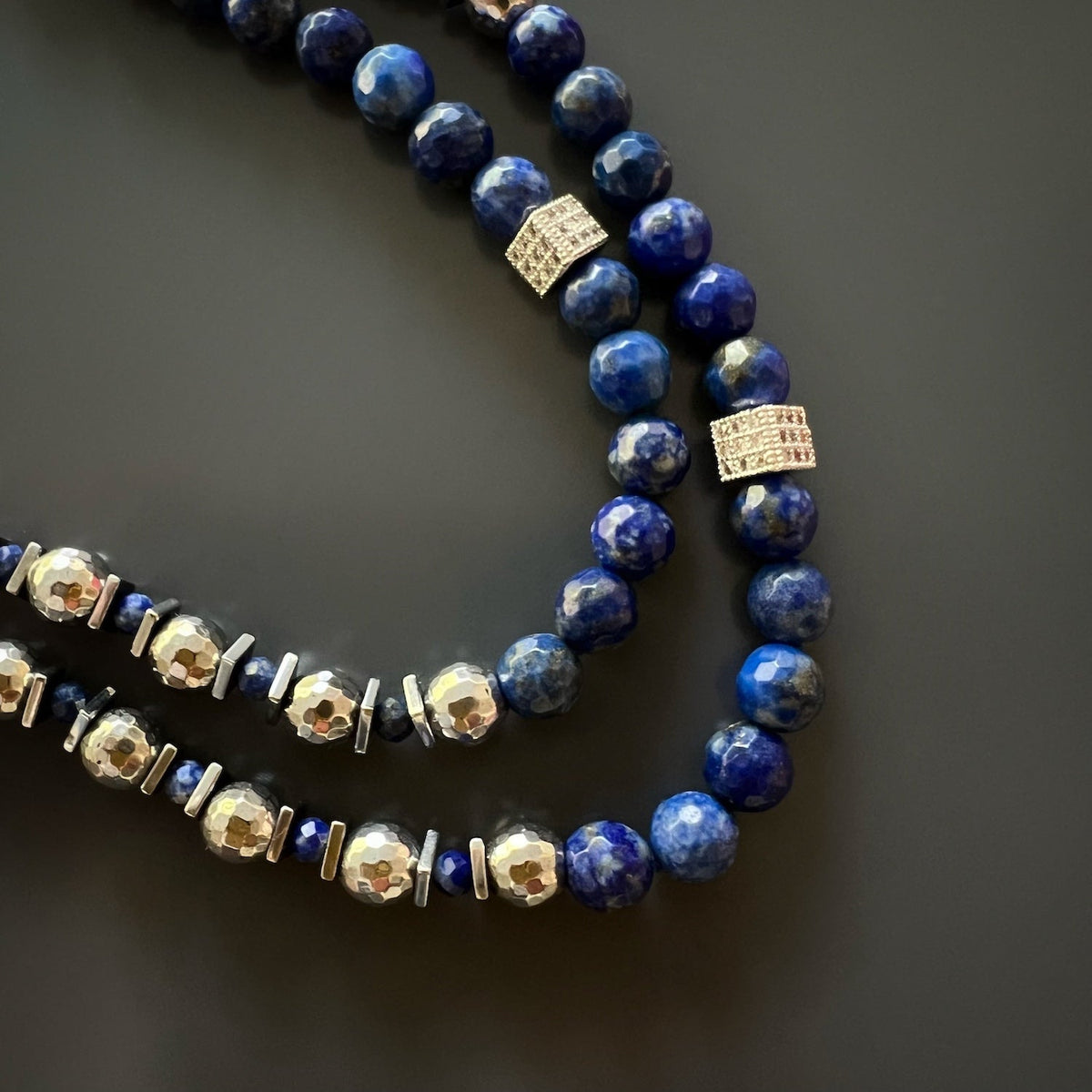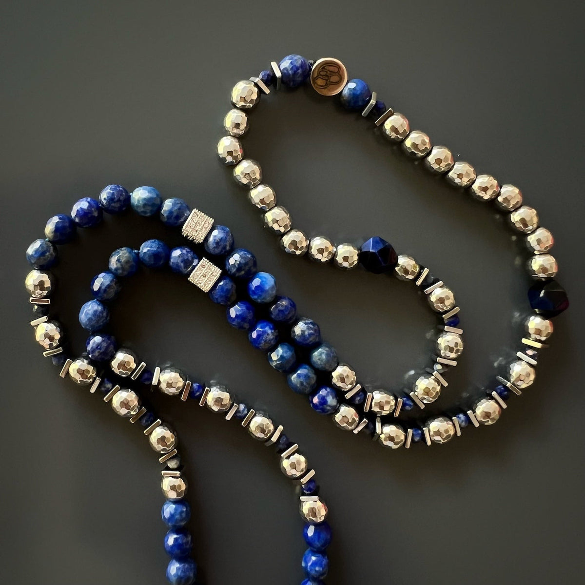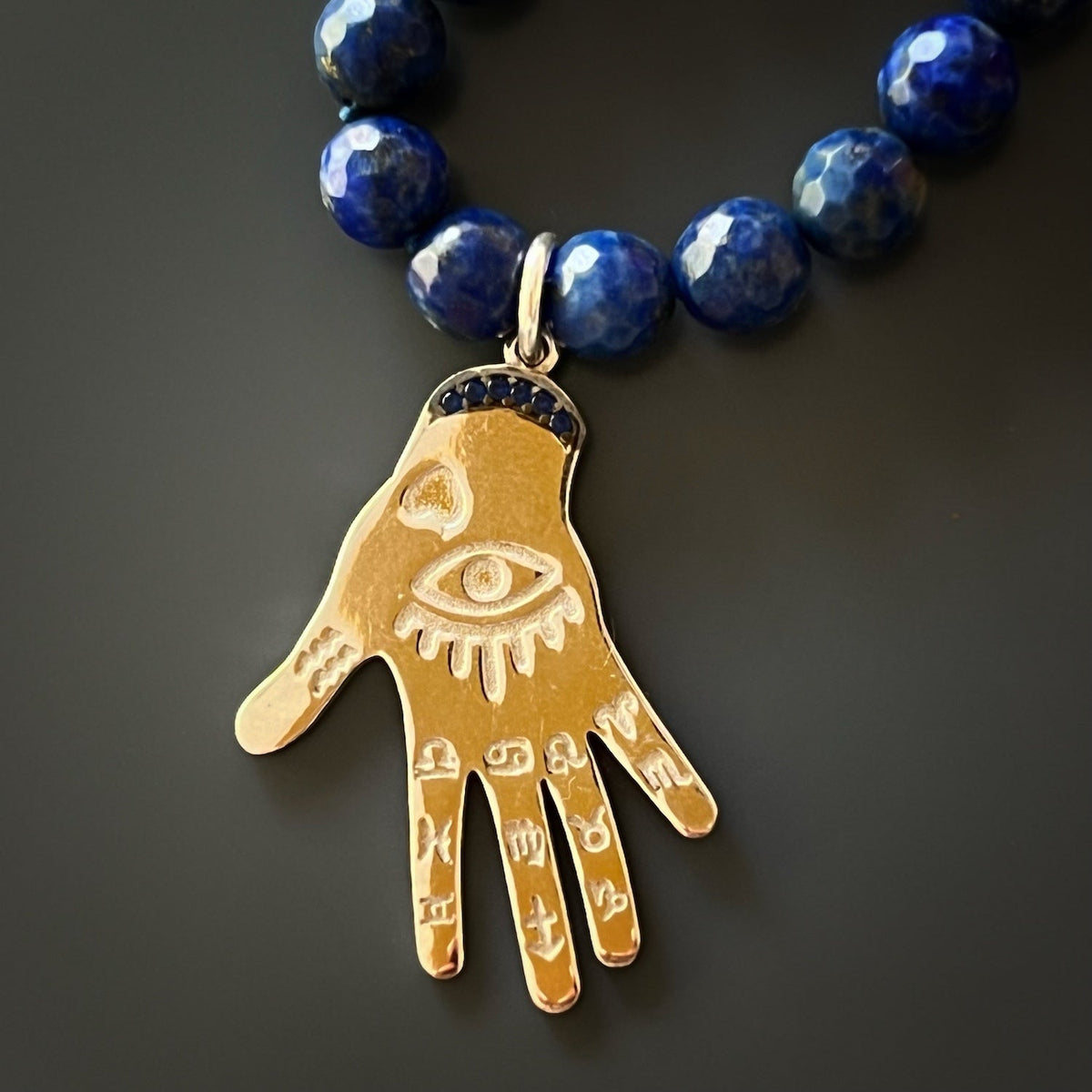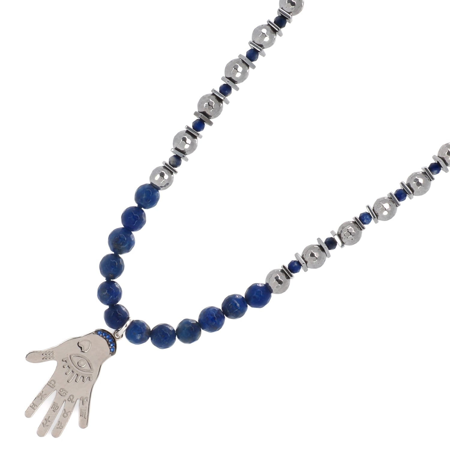 This necklace features a Sterling silver Hamsa pendant with blue Swarovski crystals. The beaded chain is made with Faceted Lapis Lazuli stone, Silver hematite stone, and Blue Tiger's Eye stone beads.