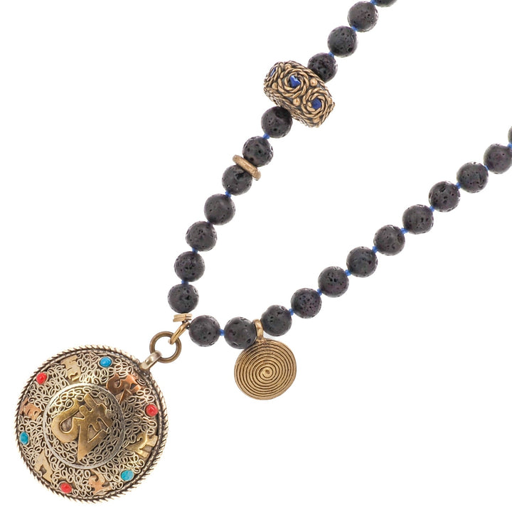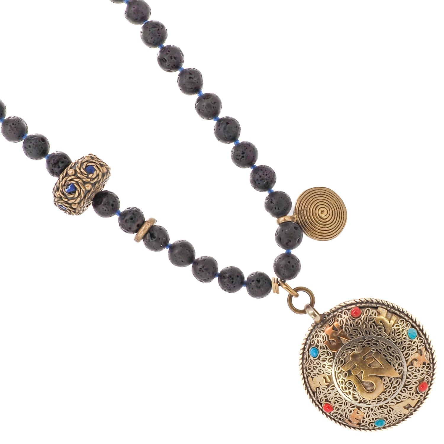 This necklace is made from lava rock beads, with a handmade brass Nepal bead featuring lapis lazuli inlay, and a large handmade Tibetan lapis lazuli and brass bead. The necklace is 46 inches long, with the pendant measuring 2 inches in height and 2 inches in width.