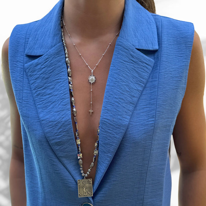 This Sterling Silver Spiritual Shaman Pendant Silver Hematite & Buddha Beaded Necklace by Ebru Jewelry is a unique and spiritually charged piece. It combines the protective qualities of hematite with the calming presence of Buddha beads, enhanced by purple pearls and a central shaman pendant. This necklace is a powerful talisman and a stylish accessory for those who appreciate spiritual energy and elegant design.