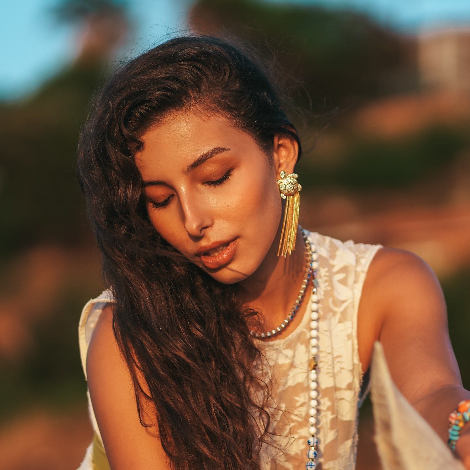 These earrings are handmade from bronze with 18-karat gold plating and are set with sparkling zircon stones. The tassels are also gold-plated.