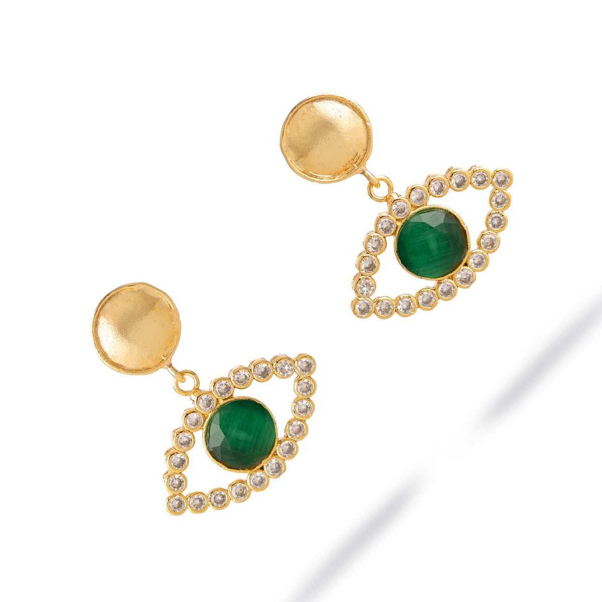 The Emerald Harmony Eye Earrings - Gold by Ebru Jewelry are a meaningful accessory designed to balance your spirit. Highlighting a deep green cat-eye stone, they are surrounded by dazzling zircon crystals. The earrings are crafted with bronze and plated with 18k gold. They embody harmony, growth, and spiritual protection.