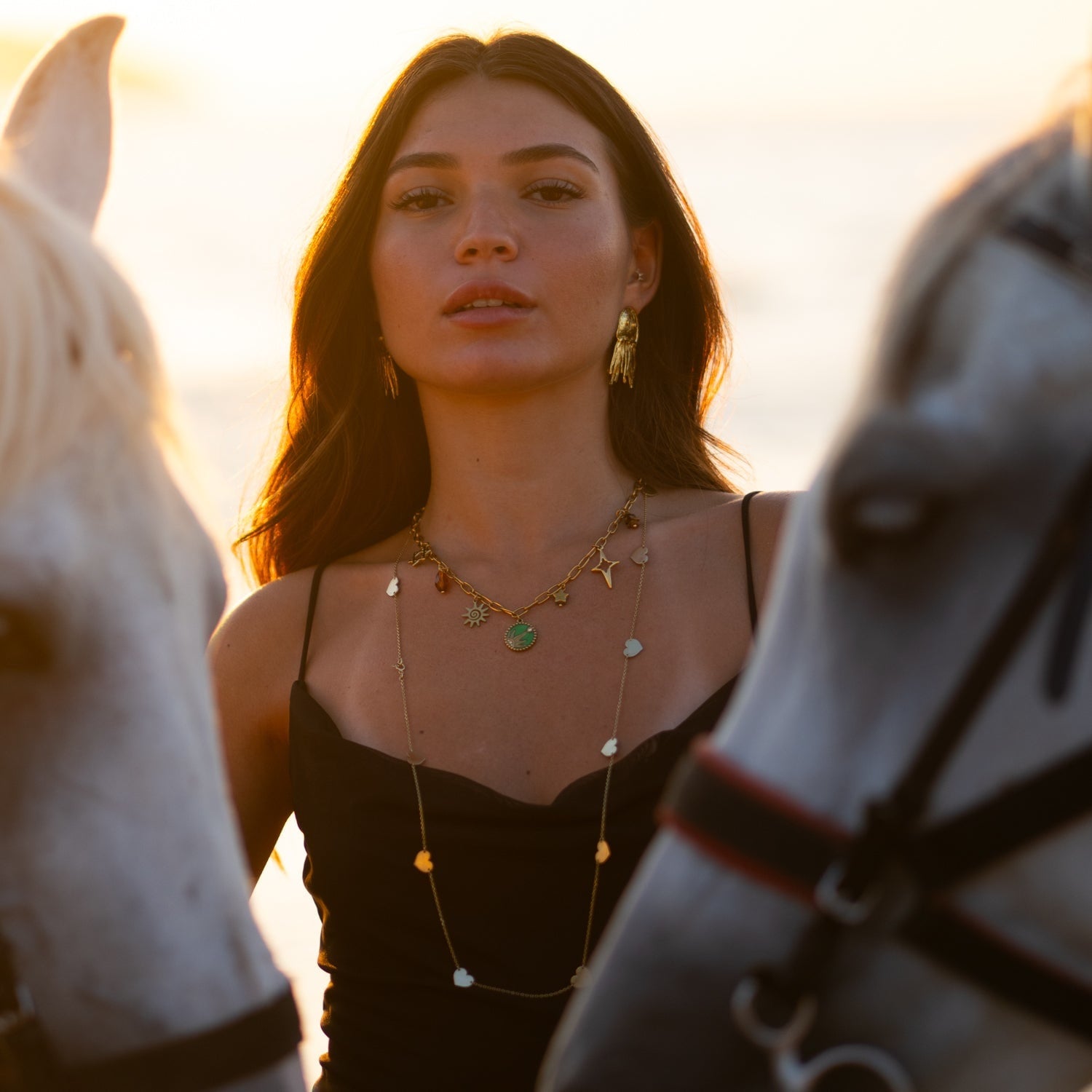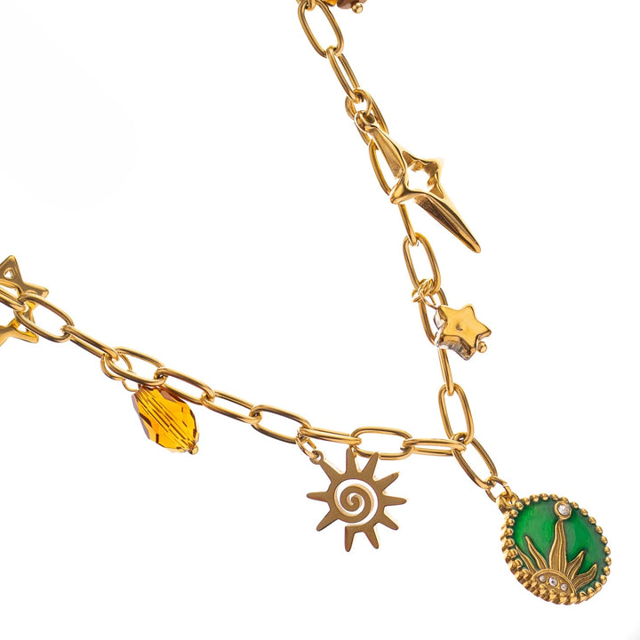 This necklace is made from water-resistant, tarnish-free stainless steel with high-quality gold plating. It features enamel and semi-precious stone charms and has a length of 16 inches with a 2-inch extender.