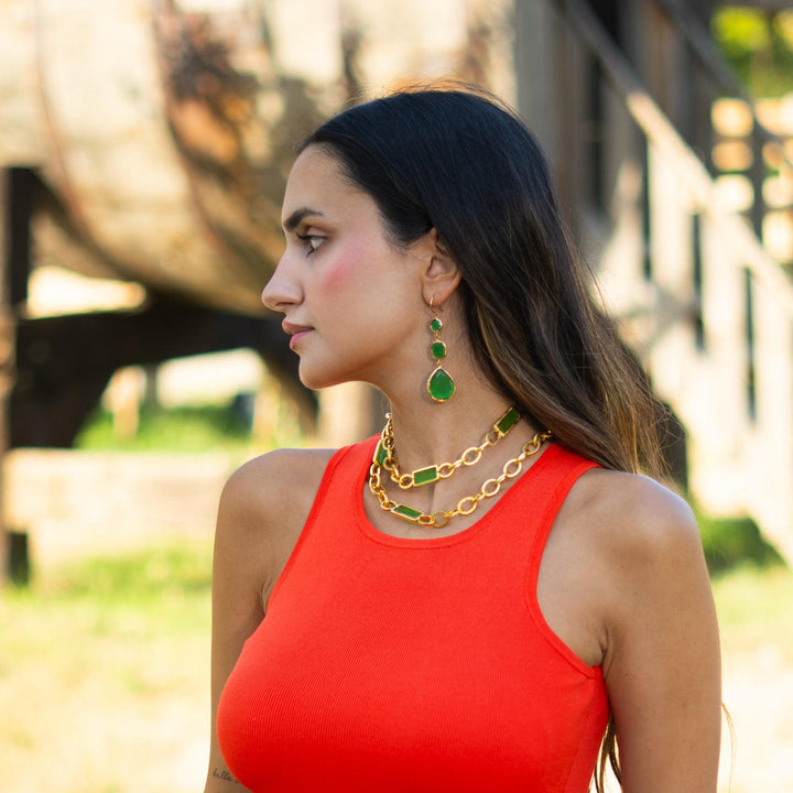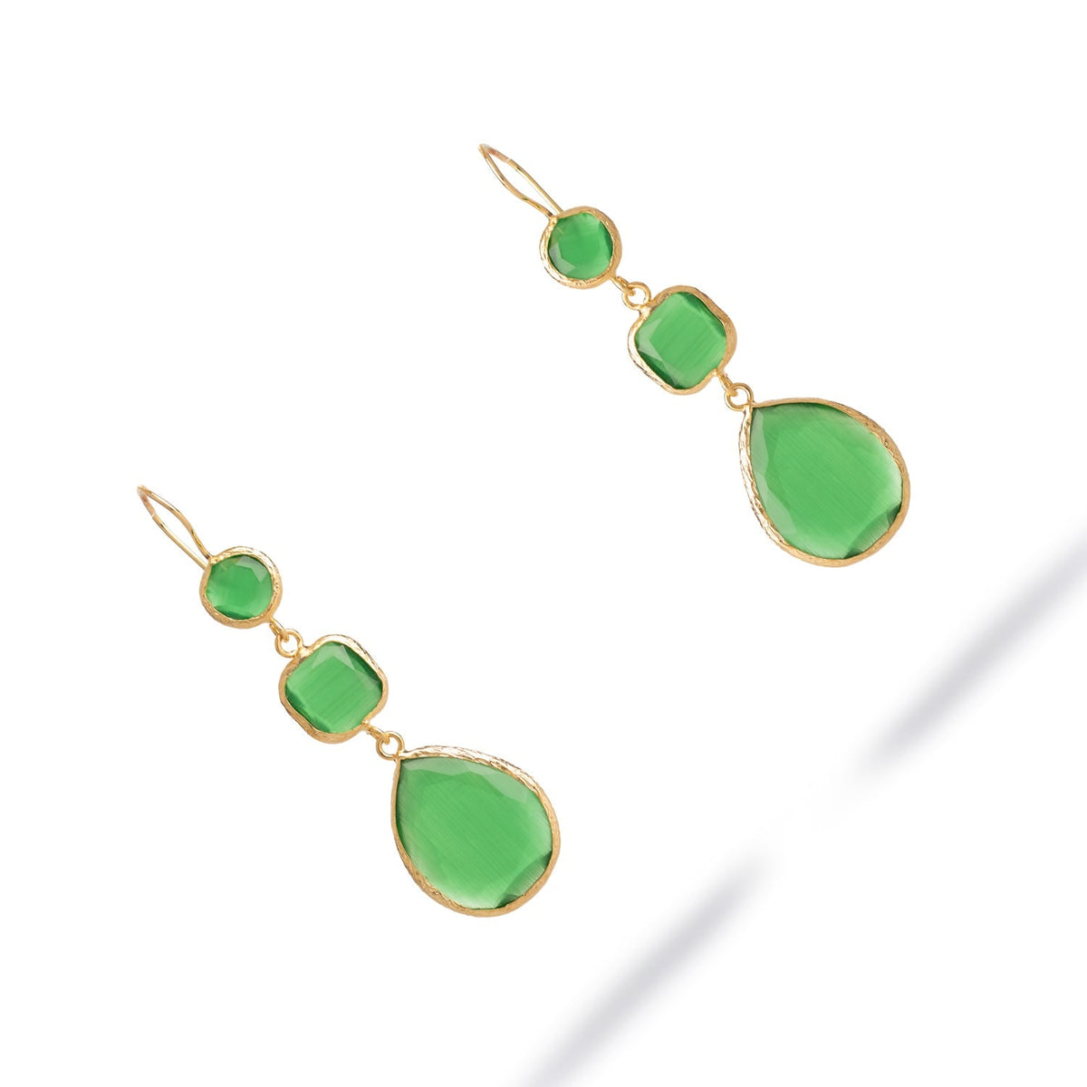 These earrings are crafted from bronze with 18k gold plating and are set with green cat eye gemstones. The earring length is approximately 2 inches.