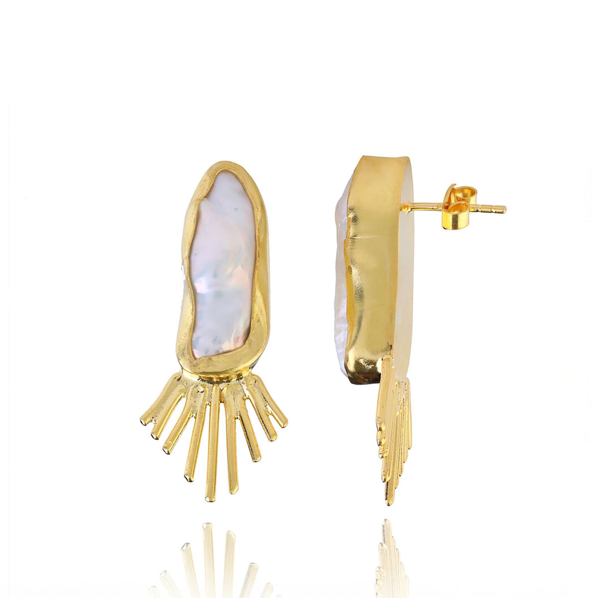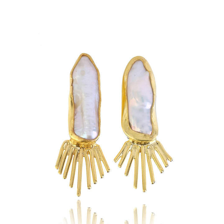 The Theia Pearl Earrings by Ece London are an exquisite and meaningful accessory inspired by the Greek goddess of light. Hand-sculpted, these earrings feature a 22K gold vermeil body with prolonging ends that represent heavenly light rays, beautifully accentuating the uniquely shaped Keshi Baroque pearls. This piece embodies a sense of purity and wisdom, making each pair a unique work of art.