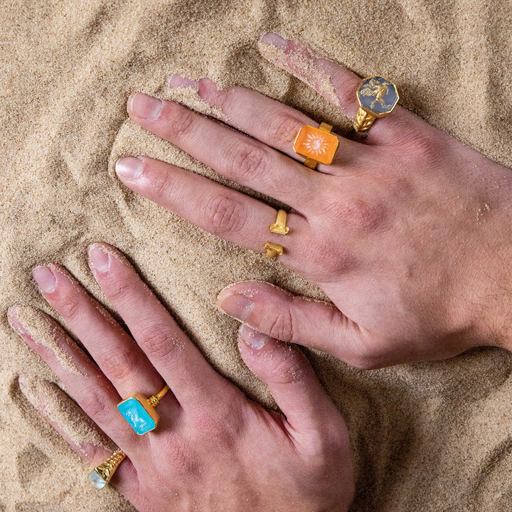 The Pegasus Ring by Ece London is a timeless piece that takes its name from the mythical winged horse. It combines 22K gold vermeil with an alluring, one-of-a-kind chalcedony gemstone. The ring features an intaglio of a rearing Pegasus, a symbol of power, immortality, and devotion. This piece is a unique demonstration of masterful artistry and profound meaning.