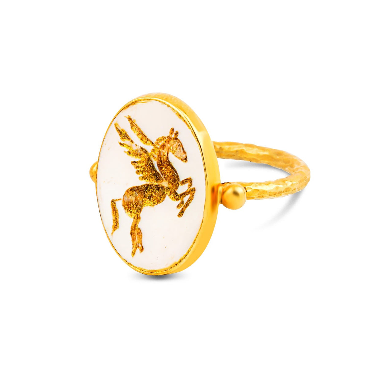 The Pegasus I I Ring by Ece London is a timeless piece with a mythical soul. Named after the immortal winged horse, this signet ring features an exquisite mother of pearl gemstone with a unique intaglio of a rearing Pegasus, a symbol of power, immortality, and protection. The intricate craftsmanship and 22K gold vermeil finish give it a rich, luxurious feel, making it a sophisticated accessory that tells a story of ancient myth and masterful artistry.