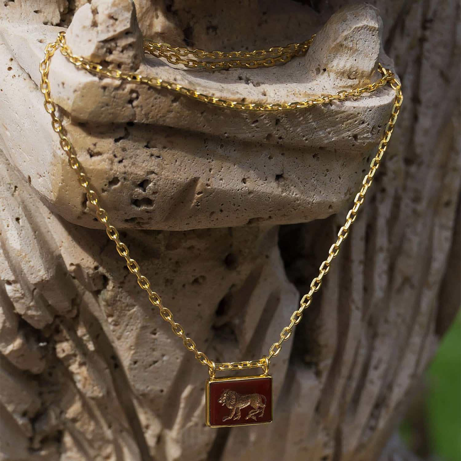 This Aslan Necklace by Ece London is a magnificent pendant that draws its name from the Turkish word for lion, "Aslan," a symbol of strength and endurance. The pendant combines the power of the lion with the vibrant energy of a carnelian stone. The hand-sculpted carnelian is surrounded by 22k gold vermeil on 925 sterling silver, with gold leaf embellishments on the intaglios. The open-back design allows the natural stone to touch the skin, enhancing its properties.