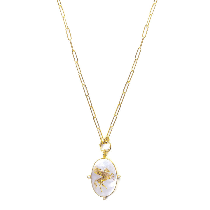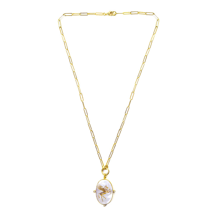This The Pegasus Ii Necklace by Ece London celebrates the mythical winged horse, a symbol of inspiration and freedom. The pendant features a hand-engraved Pegasus motif on a mother-of-pearl gemstone, embellished with three zircon gemstones that mimic stars. The hand-sculpted body is made from gold-plated sterling silver, and the design allows the stone to touch the wearer's skin.