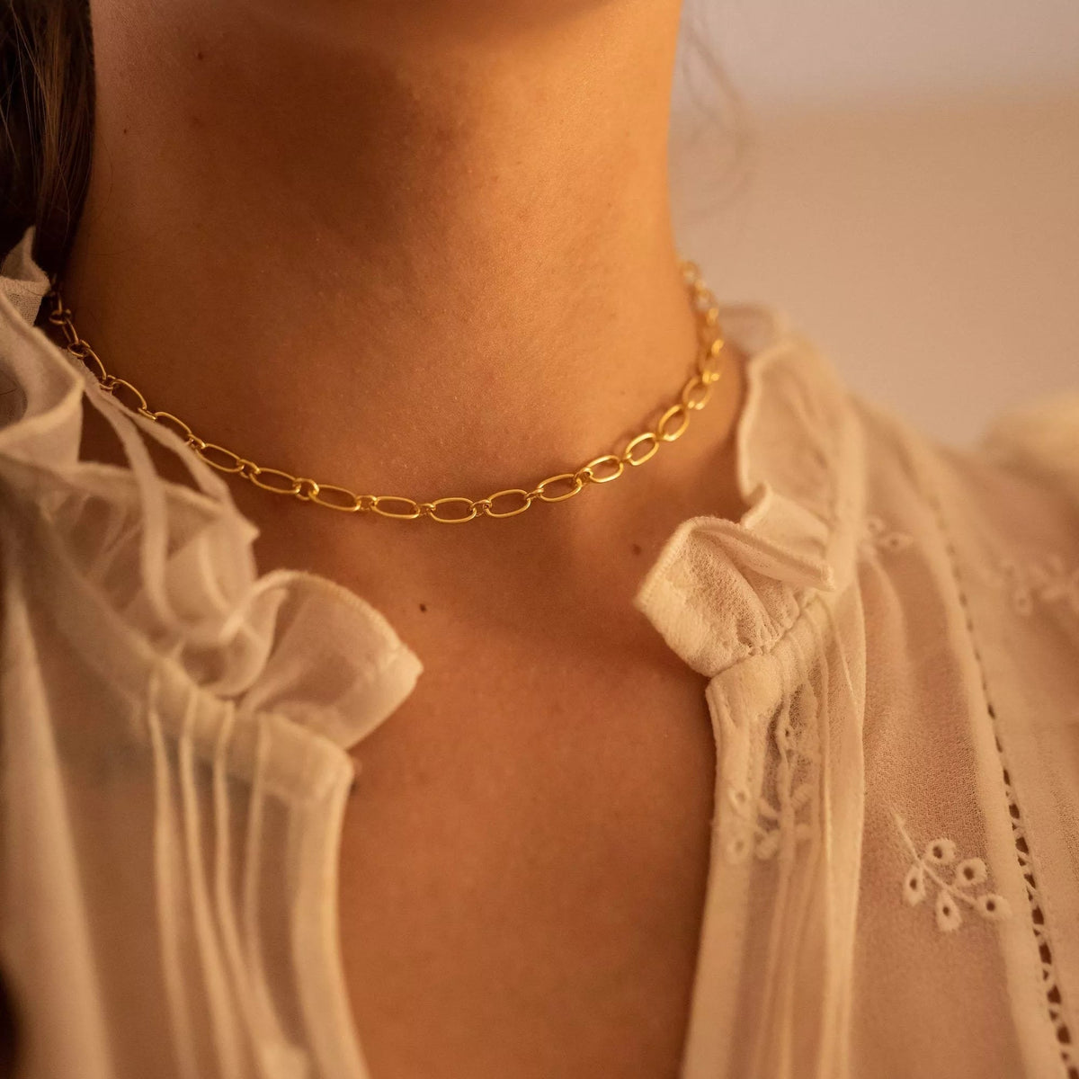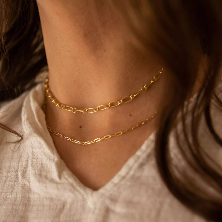 This Chunky Gold Chain Necklace by Elk & Bloom is a perfect accessory for anyone who wants a little sparkle. This thick link chain necklace is made from solid sterling silver and coated in genuine 18k gold plating. Its versatile design and shorter length make it a great choker or a perfect layering piece.