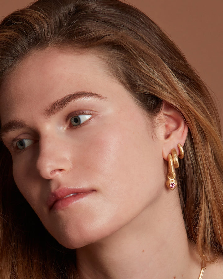 The Wander Hoops Medium With Heart Charms Pink Tourmaline by Eloise Jewelry are a meaningful duo that celebrates love, strength, and elegance. The Wander Hoops are matched with Heart Charms set with natural Pink Tourmaline, a gemstone known to promote kindness and self-love. Handmade in Italy, this set is a perfect blend of artisanal heritage and modern design.
