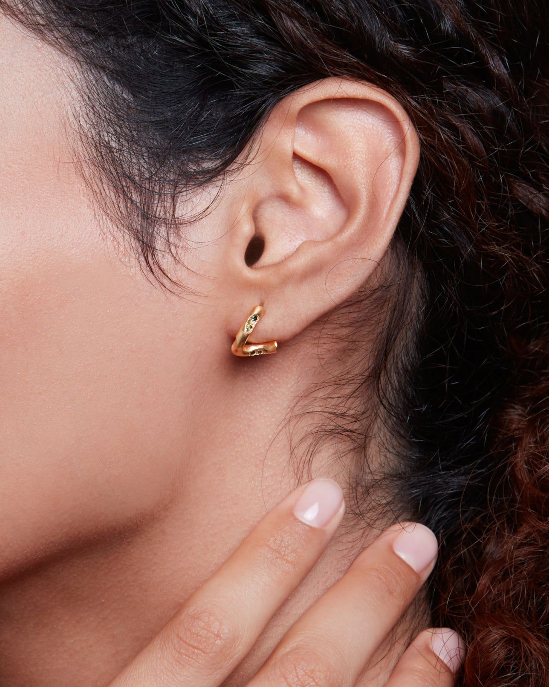 These Eden Earrings with Natural Green Diamonds by Eloise Jewelry feature a sophisticated and modern design. These huggie earrings embrace the earlobe with an unexpected twist, enriched by asymmetrical dimples with a luminous micro pavé of green diamonds. The shiny and hypnotic effect of the gems evokes the reflections of lush vegetation on crystal-clear waters, making them a unique and luxurious accessory.