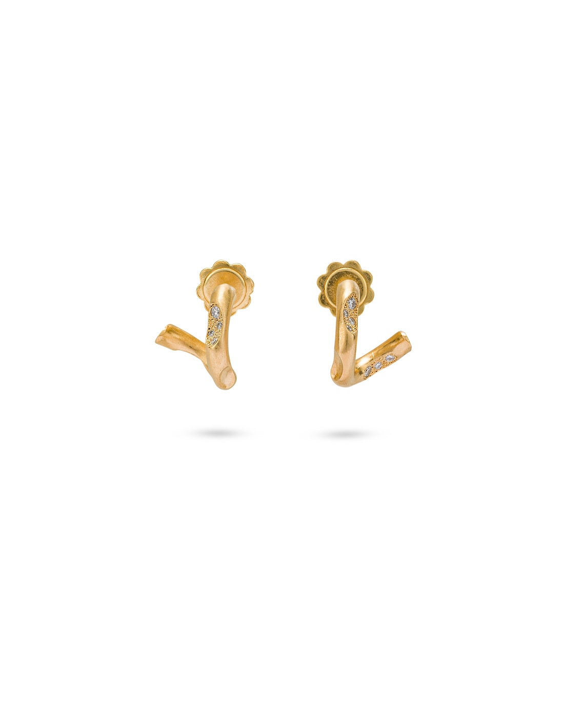 The Eden Earrings by Eloise Jewelry are huggie-style earrings with a sinuous shape that embraces the earlobe. They are enriched with luminous asymmetrical micro pavé diamonds. The sculptural interplay of solids and voids in their design makes them a unique and elegant accessory for those who want to stand out. They are 100% handmade in Italy with conflict-free diamonds.