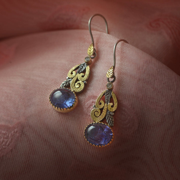 These earrings are handmade from 18-karat gold and oxidized sterling silver. They are embedded with tanzanite and diamonds. The dimensions are 40mm from the top of the hook and 12mm wide.