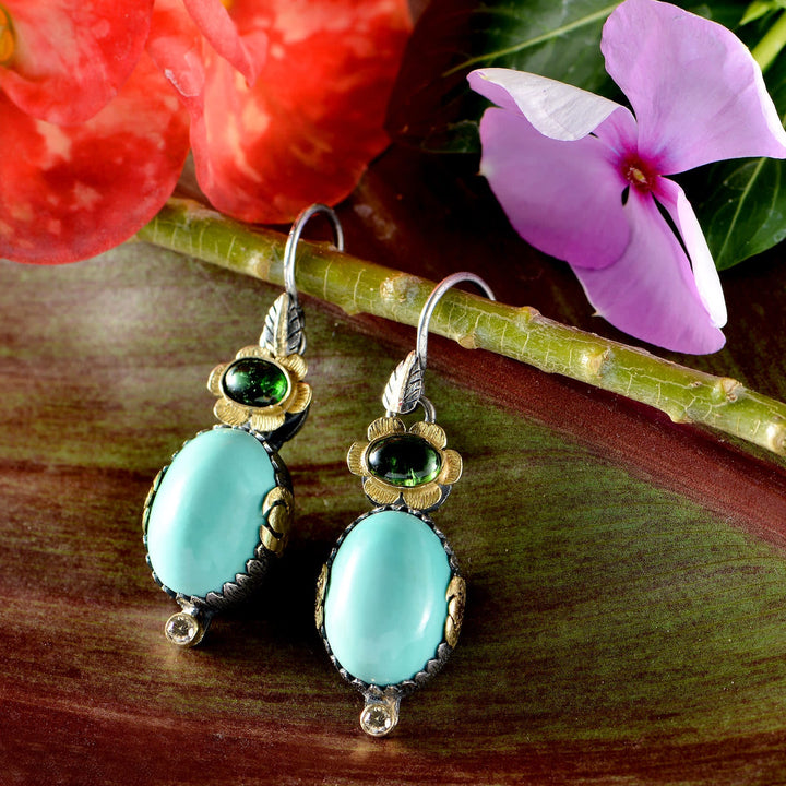 These one-of-a-kind dangle earrings are handmade from a mixture of 18ct gold and oxidized sterling silver. They are embedded with turquoise, green tourmalines, and diamonds. The earrings measure 35mm x 10mm.