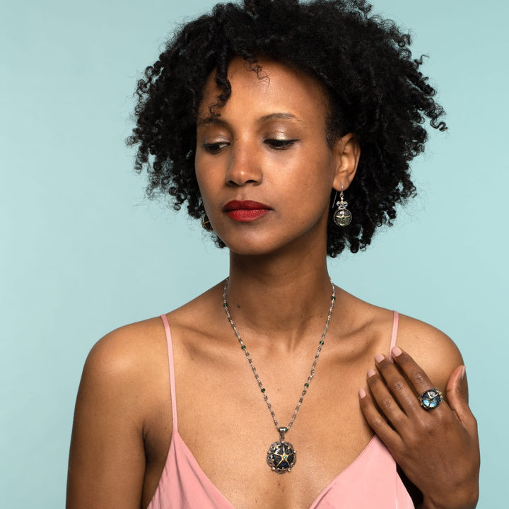 These Labradorite Emerald Diamond Statement Dangle Earrings by Emma Chapman Jewels are a one-of-a-kind, handcrafted masterpiece. They feature stunning hand-carved labradorites embedded with emeralds and capped with full-cut diamonds. The earrings are made in oxidized sterling silver with 18ct gold hand-engraved motifs and exquisite jaali work on the back, showcasing a rare level of artistry. These luxurious earrings are a perfect statement piece that blends modern design with traditional craftsmanship.