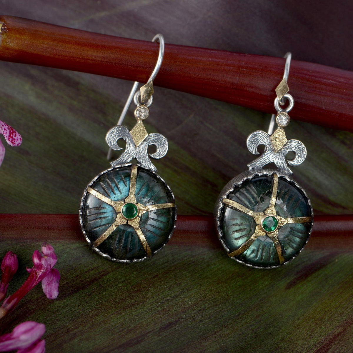 These earrings are handmade with oxidized sterling silver and 18ct gold, embedded with labradorite, emeralds, and full-cut diamonds. They are 40mm from the top of the hook and 18mm wide.