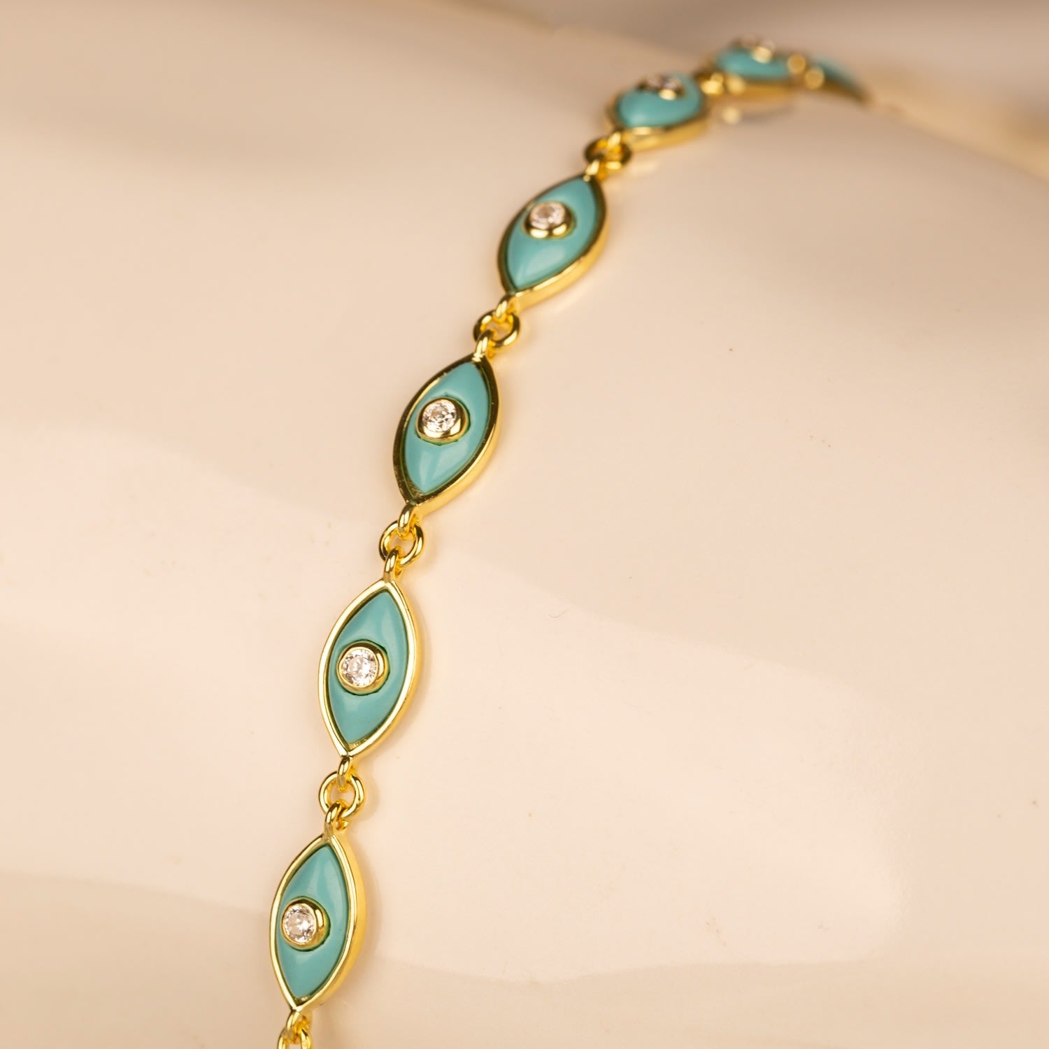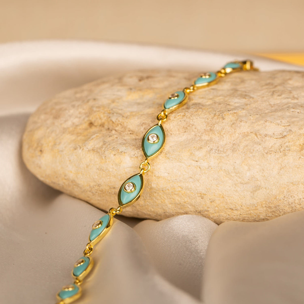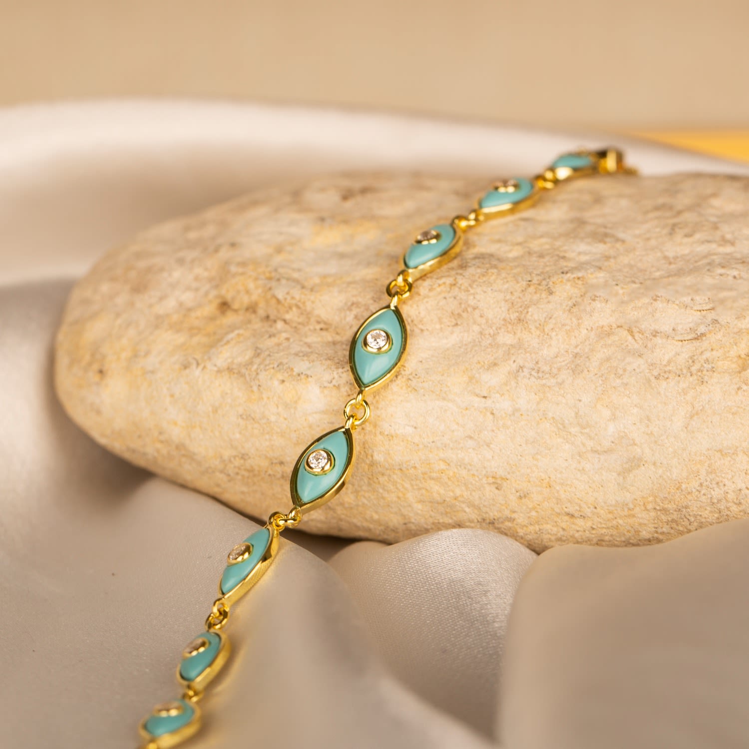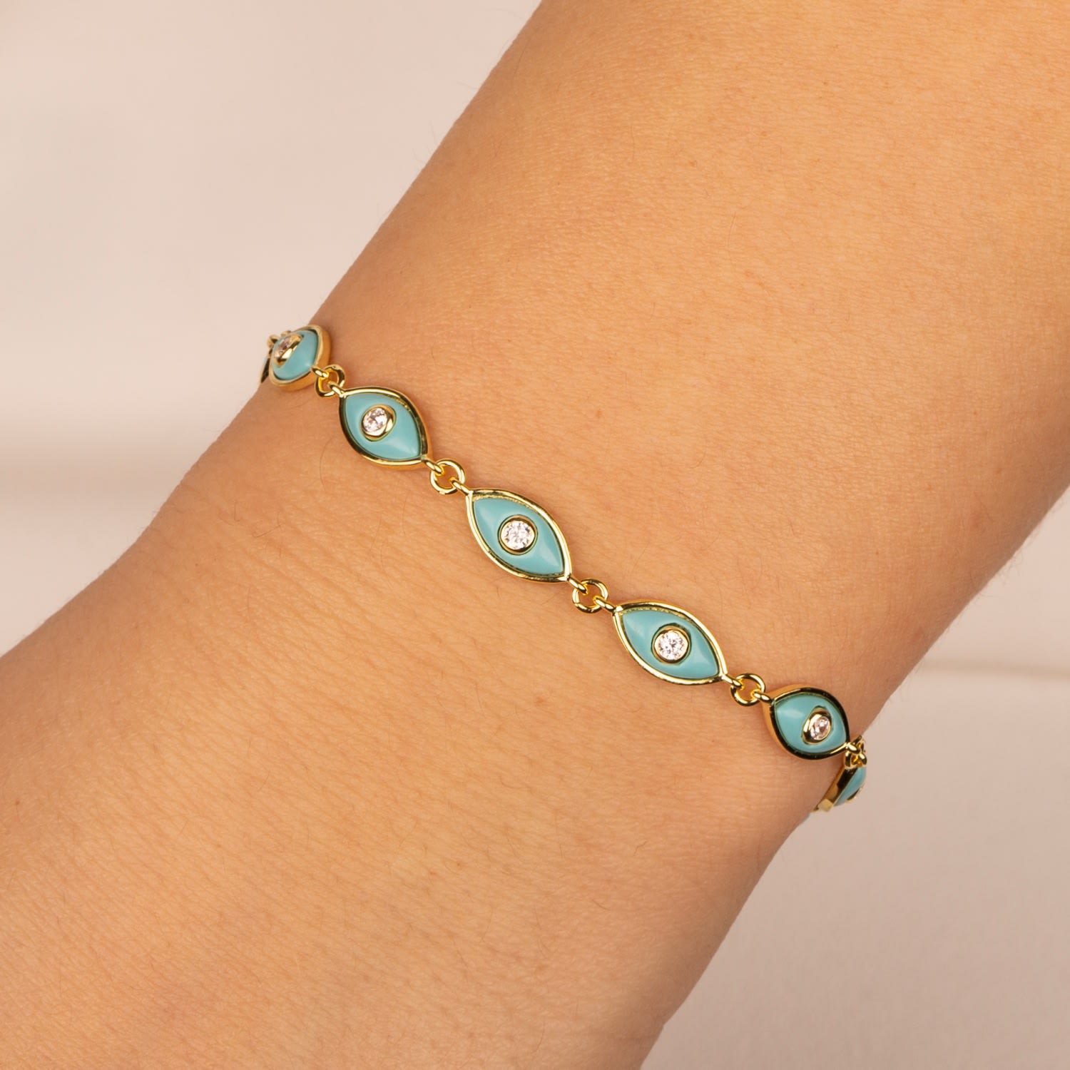 This Evil Eye Turquoise Bracelet by Ep Designs is a new and stylish accessory perfect for everyday wear. This tennis bracelet is made from 925 sterling silver and features a turquoise stone and cubic zirconia stones in an evil eye design.