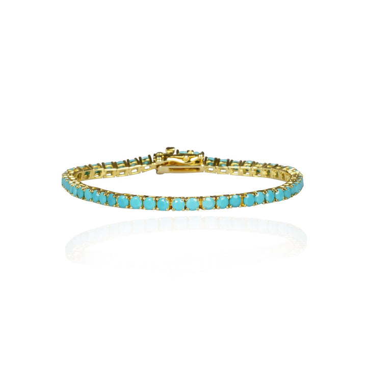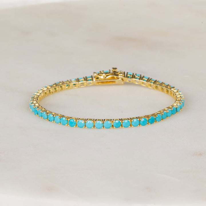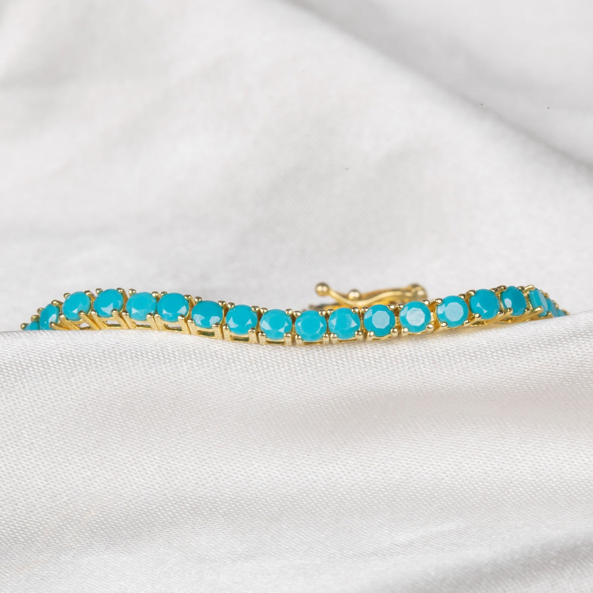 This tennis bracelet is crafted from 925 sterling silver with a 3mm turquoise stone and cubic zirconia stones.