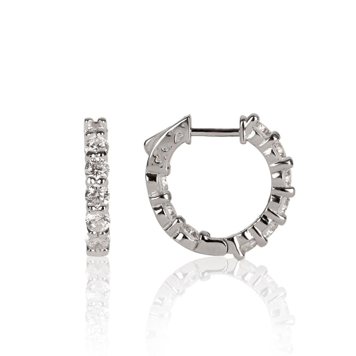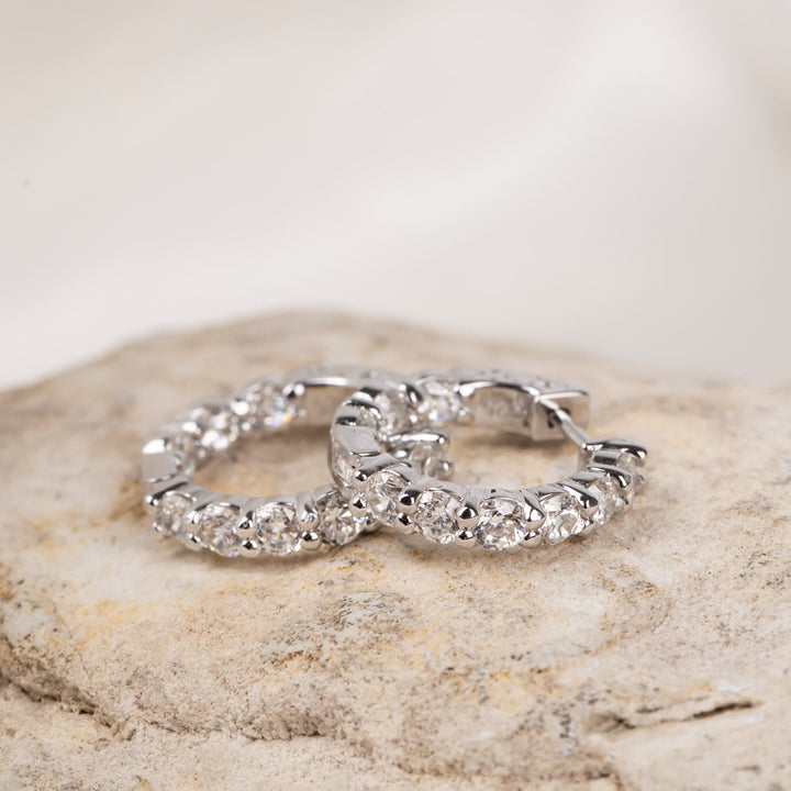 These huggie hoop earrings are crafted from rhodium silver and are set with moissanite stones. They have a snap closure and are sold as a pair.