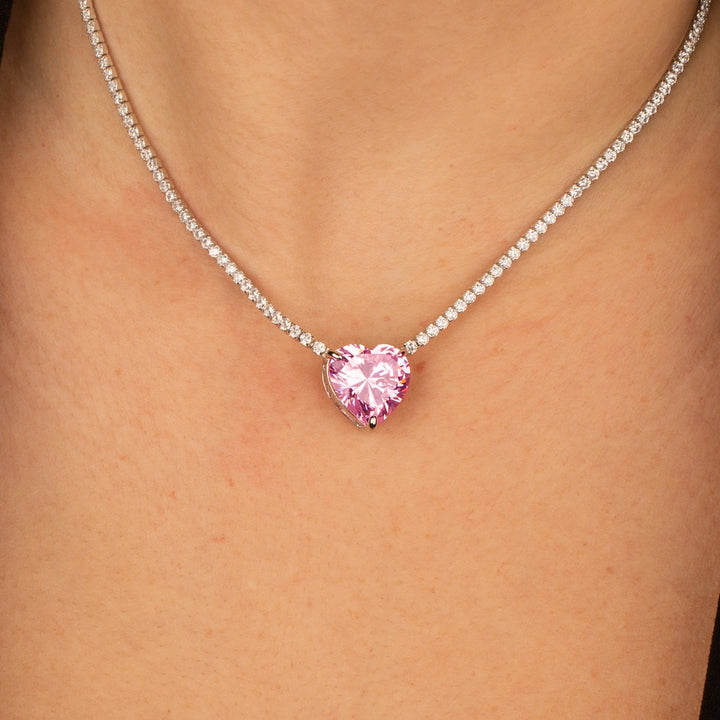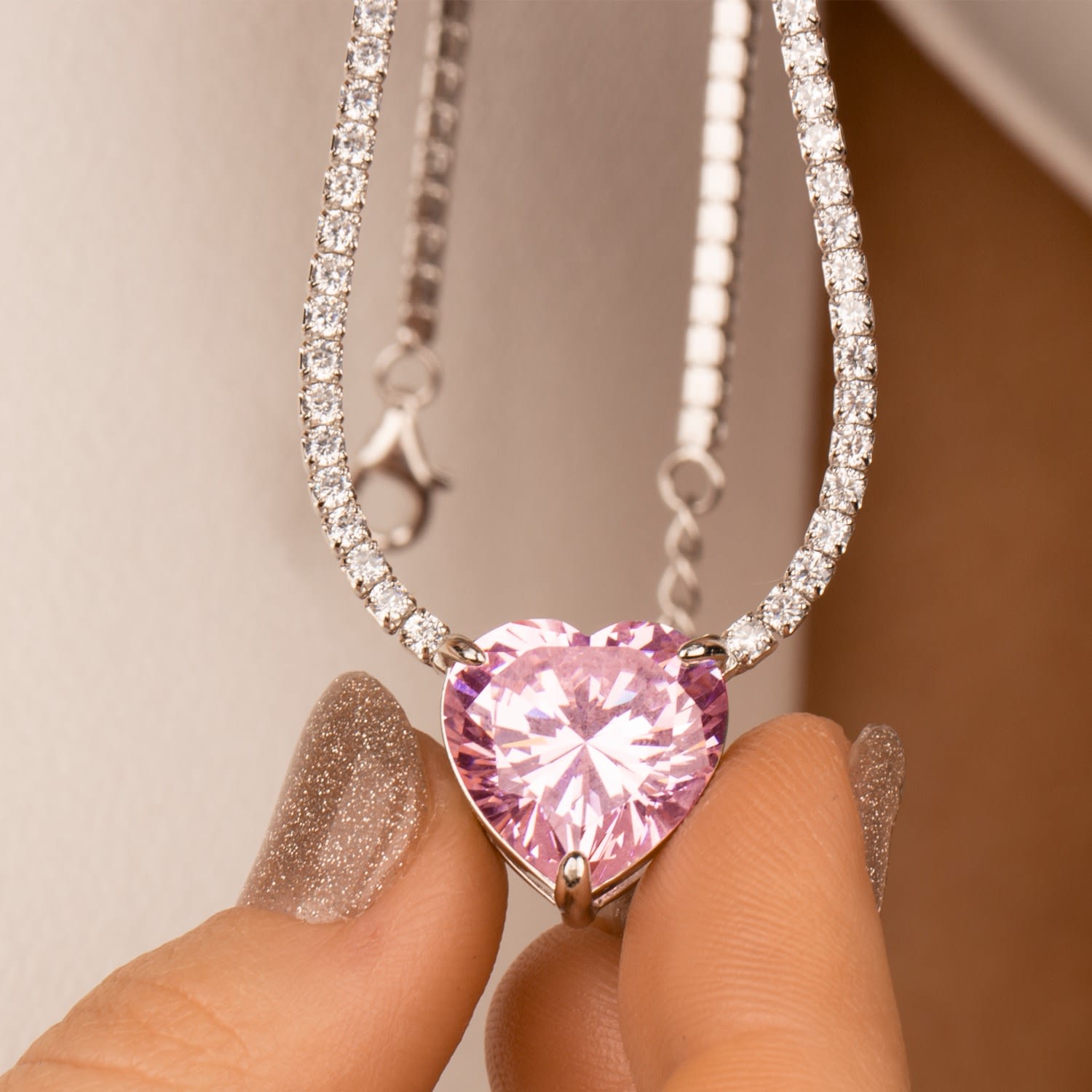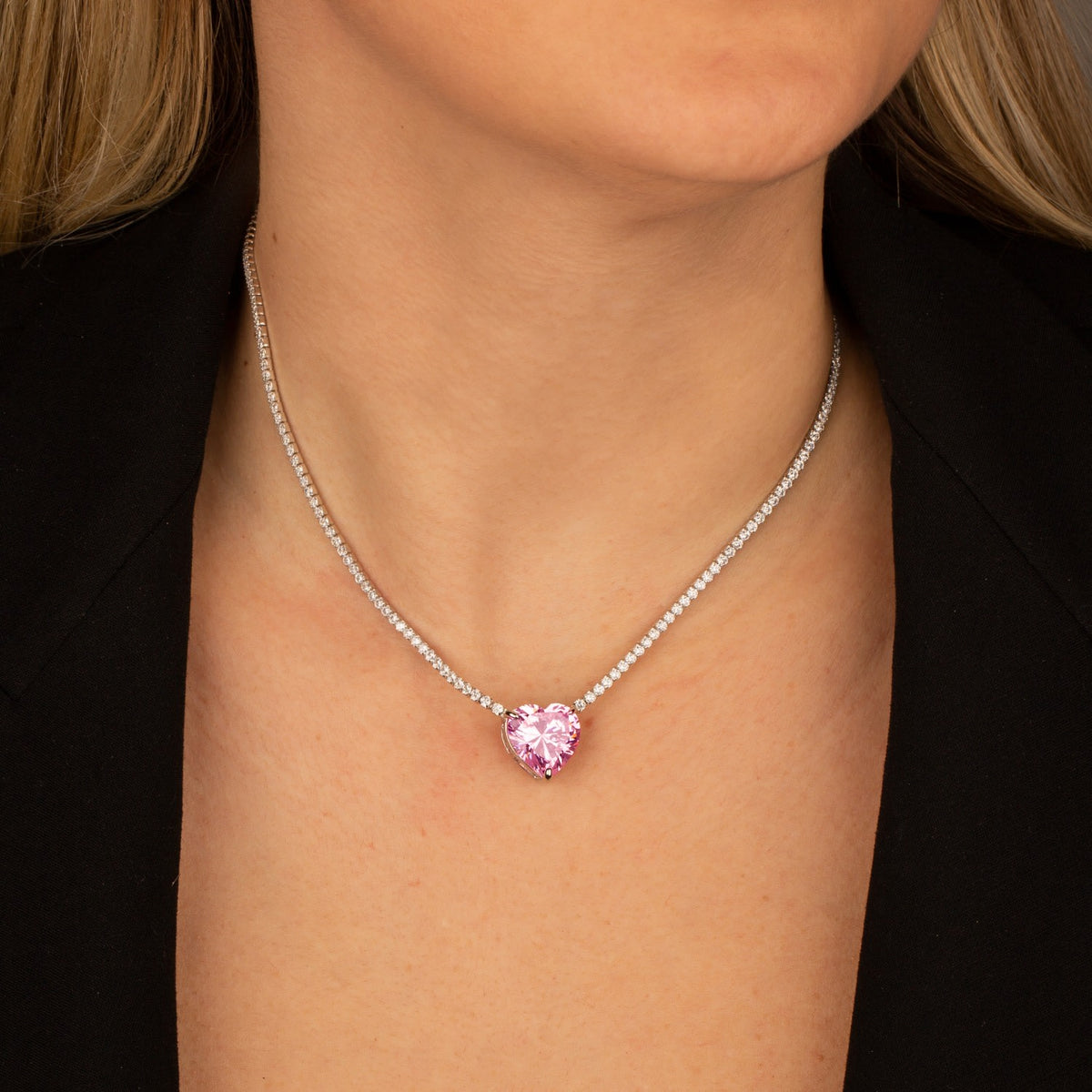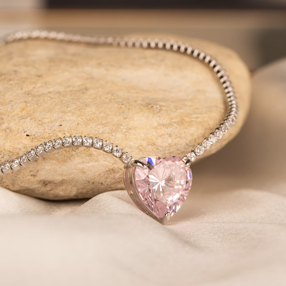 This handmade choker necklace is crafted from 925 sterling silver and features a pink heart.