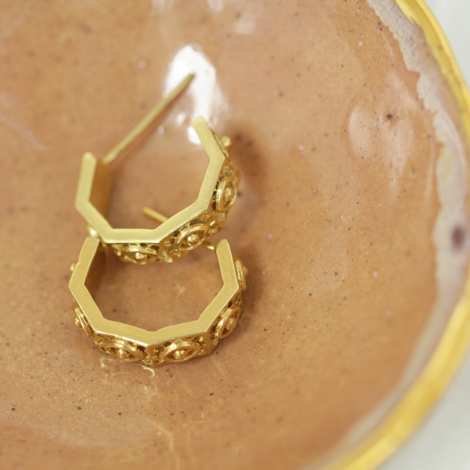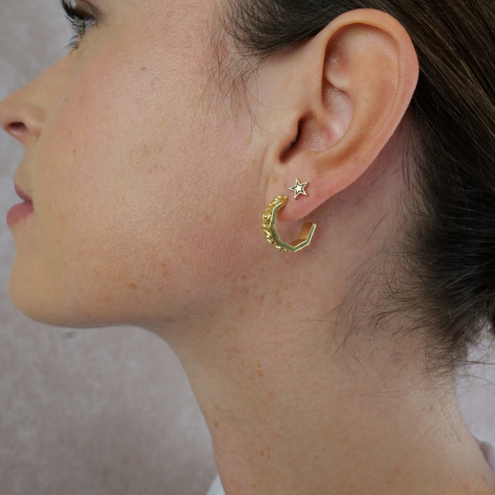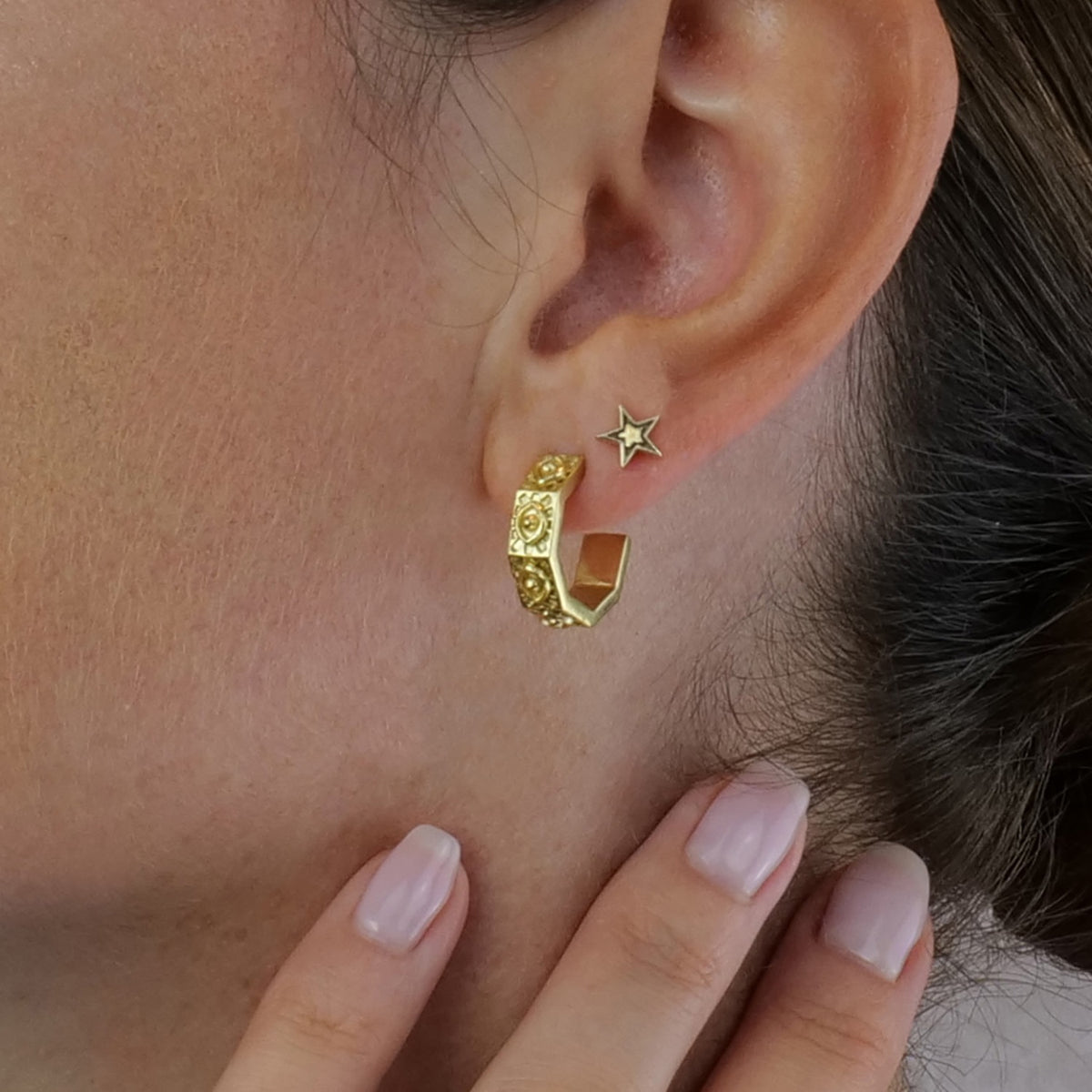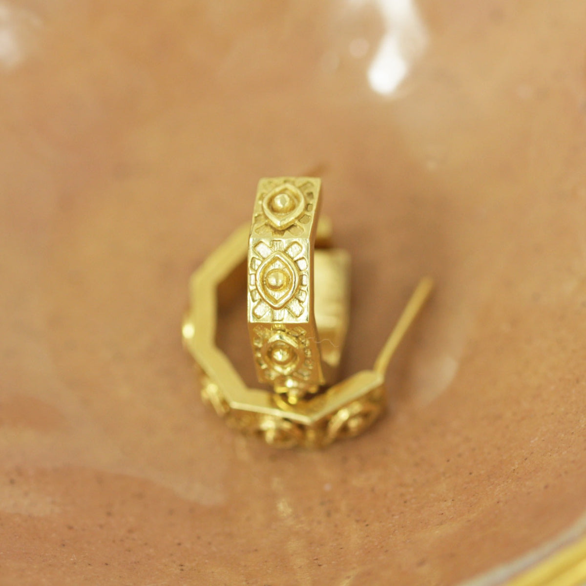 These Hexagonal Huggies Evil Eye Gold Earrings by Etta Burton Jewellery are anything but ordinary. The modern, hexagonal shape is etched with the protective evil eye symbol, beautifully weaving ancient symbolism into a contemporary design. These huggies are endlessly wearable and effortlessly transition from day to night. They are perfect for sparking conversation and celebrating individuality with a unique blend of modern style and meaningful protection.