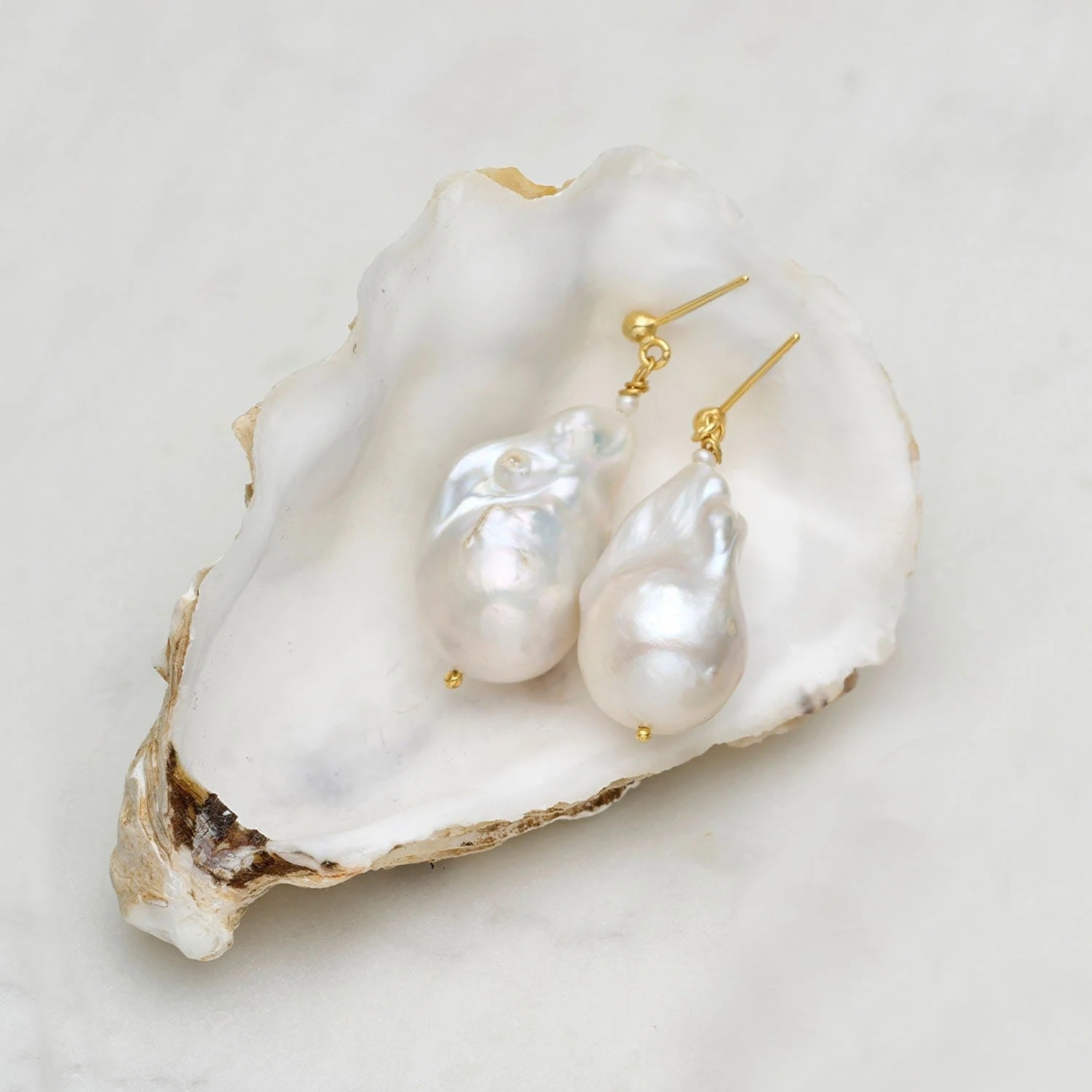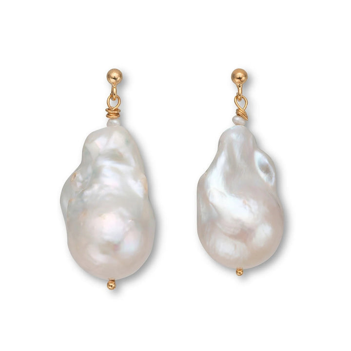 These pearl earrings are statement earrings with a gold finish and white baroque pearls.